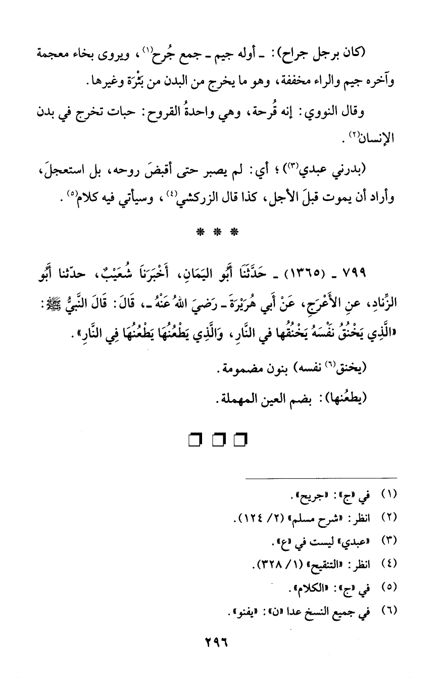799 - (1365) - حَدَّثَنَا أبو اليَمَانِ، أَخْبَرَنَا شُعَيب، حدّثنا أَبُو الزِّنادِ، عنِ الأَعْرَجِ، عَنْ أَبي هُرَيْرَةَ -رَضيَ اللهُ عَنْهُ-، قَالَ: قَالَ النَّبيُّ - صلى الله عليه وسلم -: "الَّذِي يَخْنُقُ نفسَهُ يَخْنُقُها في النَّارِ، وَالَّذِي يَطْعُنُها يَطْعُنُها فِي النَّارِ".