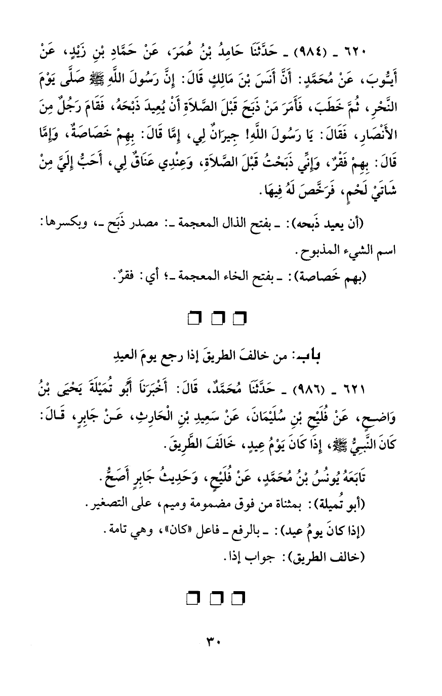 620 - (984) - حَدَّثَنا حامِدُ بْنُ عُمَرَ، عَنْ حَمّادِ بْنِ زيدٍ، عَنْ أَيُّوبَ، عَنْ مُحمدٍ: أَن أَنس بْنَ مالِكٍ قَالَ: إِنَّ رَسُولَ اللهِ - صلى الله عليه وسلم - صلَّى يَوْمَ النَّحْرِ، ثُمَّ خَطَبَ، فَأَمَرَ مَنْ ذَبَحَ قَبْلَ الصَّلاَةِ أَنْ يُعِيدَ ذَبْحَهُ، فَقامَ رَجُلٌ مِنَ الأَنْصارِ، فَقالَ: يا رَسُولَ اللهِ! جِيرانٌ لِي، إِمّا قَالَ: بِهِمْ خَصاصَةٌ، وَإِمّا قَالَ: بِهِمْ فَقْرٌ، وَإِنِّي ذَبَحتُ قَبْلَ الصَّلاَةِ، وَعِنْدِي عَناقٌ لِي، أَحَبُّ إِلَيَّ مِنْ شاتَيْ لَحْمٍ، فَرَخَّصَ لَهُ فِيها.