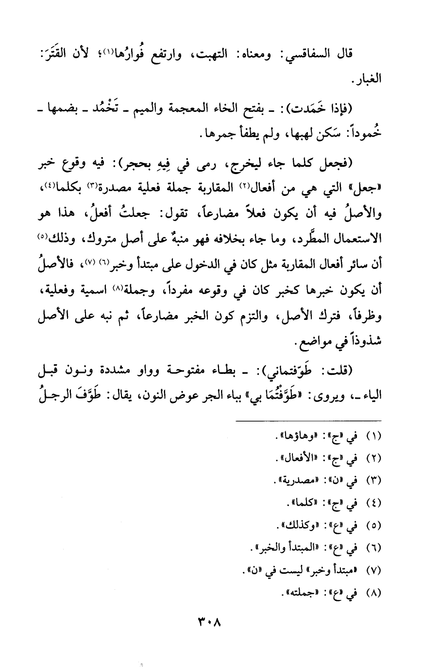 (فجعل كما جاء ليخرج، رمى في فِيهِ بحجر): فيه وقوع خبر "جعل" التي هي من أفعال (¬2) المقاربة جملة فعلية مصدرة (¬3) بكلما (¬4)، والأصلُ فيه أن يكون فعلاً مضارعاً، تقول: جعلتُ أفعلُ، هذا هو الاستعمال المطَّرد، وما جاء بخلافه فهو منبهٌ على أصل متروك، وذلك (¬5) أن سائر أفعال المقارية مثل كان في الدخول على مبتدأ وخبر (¬6) (¬7)، فالأصلُ أن يكون خبرها كخبر كان في وقوعه مفرداً، وجملة (¬8) اسمية وفعلية، وظرفاً، فترك الأصل، والتزم كون الخبر مضارعاً، ثم نبه على الأصل شذوذاً في مواضع.