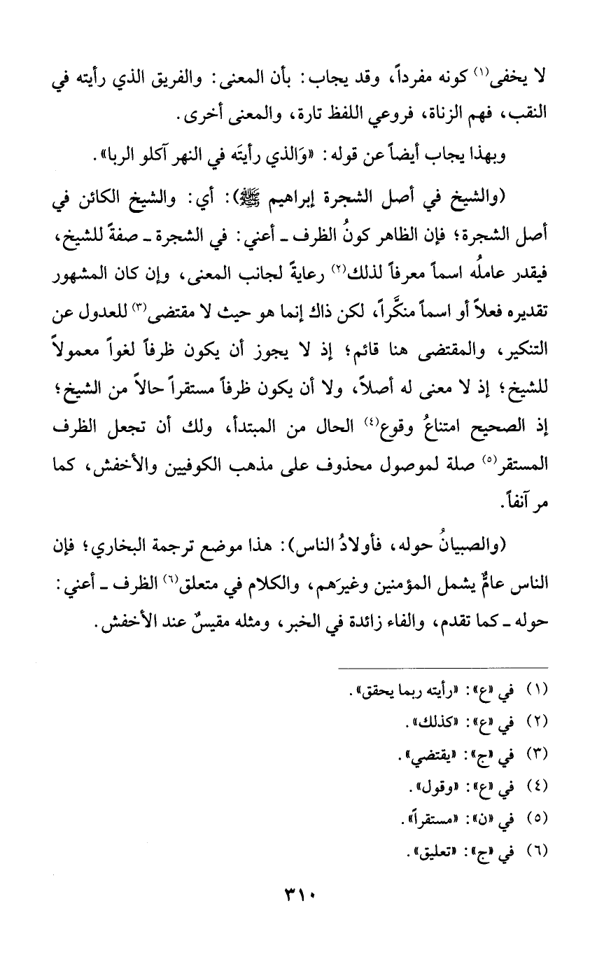 (والشيخ في أصل الشجرة إبراهيم - صلى الله عليه وسلم -): أي: والشيخ الكائن في أصل الشجرة؛ فإن الظاهر كونُ الظرف -أعني: في الشجرة- صفةً للشيخ، فيقدر عاملُه اسماً معرفاً لذلك (¬2) رعايةً لجانب المعنى، وإن كان المشهور تقديره فعلاً أو اسماً منكَّراً، لكن ذاك إنما هو حيث لا مقتضى (¬3) للعدول عن التنكير، والمقتضى هنا قائم؛ إذ لا يجوز أن يكون ظرفاً لغواً معمولاً للشيخ؛ إذ لا معنى له أصلاً، ولا أن يكون ظرفاً مستقراً حالاً من الشيخ؛ إذ الصحيح امتناعُ وقوع (¬4) الحال من المبتدأ، ولك أن تجعل الظرف المستقر (¬5) صلة لموصول محذوف على مذهب الكوفيين والأخفش، كما مر آنفاً.
