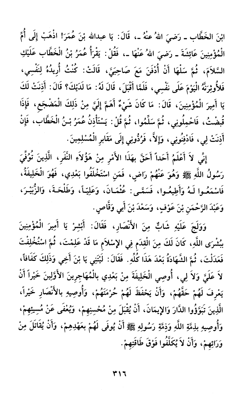 إِنِّي لَا أَعلَمُ أَحَداً أَحَق بهذَا الأَمْرِ مِنْ هؤُلاَءَ النَّفَرِ، الَّذِينَ تُوُفِّيَ رَسُولُ اللَّهِ - صلى الله عليه وسلم - وَهُوَ عَنْهُم رَاضٍ، فَمَنِ اسْتَخْلَفُوا بَعْدِي، فَهُوَ الْخَلِيفَةُ، فَاسْمَعُوا لَهُ وَأَطِيعُوا، فَسَمَّى: عُثْمَانَ، وَعَلياً، وَطَلْحَةَ، وَالزُّبَيْرَ، وَعَبْدَ الرَّحْمَنِ بْنَ عَوْفٍ، وَسَعْدَ بْنَ أَبي وَقَّاصٍ.