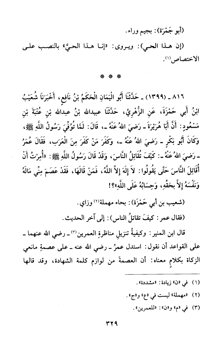 816 - (1399) - حَدَّثَنَا أَبُو الْيَمَانِ الْحَكَمُ بْنُ نَافِعٍ، أَخْبَرَنَا شُعَيْبُ ابْنُ أَبي حَمزَةَ، عَنِ الزُّهْرِيِّ، حَدَّثَنَا عبيد الله بْنُ عبد الله بْنِ عُتْبةَ بْنِ مَسْعُودٍ: أَنَّ أَبَا هُرَيْرَةَ -رَضيَ اللهُ عَنْهُ-، قَالَ: لَمَّا تُوُفَيَ رَسُولُ اللَّهِ - صلى الله عليه وسلم -، وَكَانَ أَبُو بَكْرٍ -رَضيَ اللهُ عَنْهُ-، وَكفَرَ مَنْ كفَرَ مِنَ الْعَرَب، فَقَالَ عُمَرُ -رَضيَ اللهُ عَنْهُ-: كيْفَ تُقَاتِلُ النَّاسَ، وَقَد قَالَ رَسُولُ اللَّهِ - صلى الله عليه وسلم -: "أُمرْتُ أَنْ أُقَاتِلَ النَّاسَ حَتَّى يَقُولُوا: لَا إِلَهَ إِلاَّ اللهُ، فَمَنْ قَالَها، فَمَن عَصَمَ مِنِّي مَالَهُ وَنَفْسَهُ إِلاَّ بحَقِّهِ، وَحِسَابُهُ عَلَى اللَّهِ"؟!