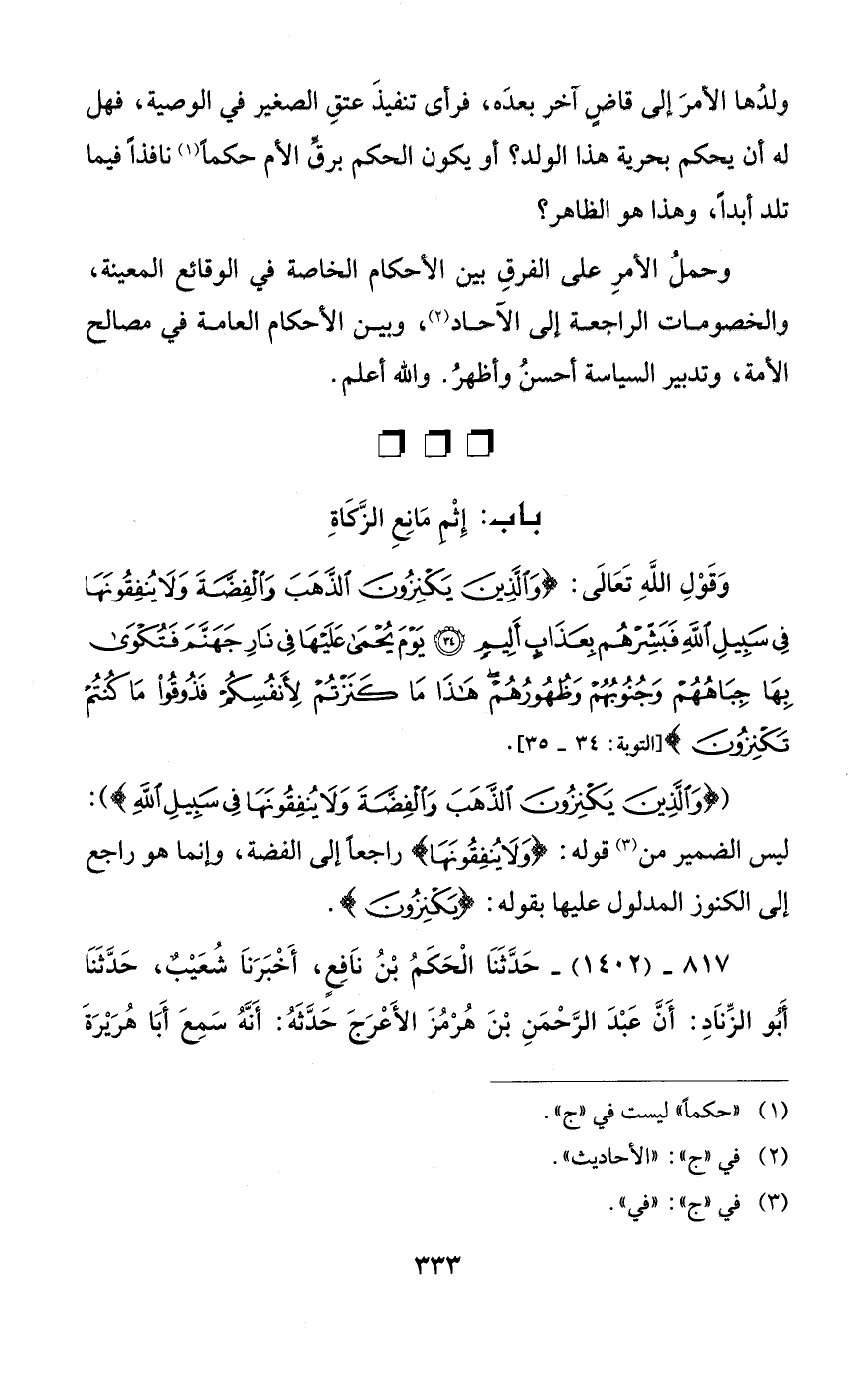 وَقَوْلِ اللَّهِ تَعَالَى: {يَاأَيُّهَا الَّذِينَ آمَنُوا إِنَّ كَثِيرًا مِنَ الْأَحْبَارِ وَالرُّهْبَانِ لَيَأْكُلُونَ أَمْوَالَ النَّاسِ بِالْبَاطِلِ وَيَصُدُّونَ عَنْ سَبِيلِ اللَّهِ وَالَّذِينَ يَكْنِزُونَ الذَّهَبَ وَالْفِضَّةَ وَلَا يُنْفِقُونَهَا فِي سَبِيلِ اللَّهِ فَبَشِّرْهُمْ بِعَذَابٍ أَلِيمٍ (34) يَوْمَ يُحْمَى عَلَيْهَا فِي نَارِ جَهَنَّمَ فَتُكْوَى بِهَا جِبَاهُهُمْ وَجُنُوبُهُمْ وَظُهُورُهُمْ هَذَا مَا كَنَزْتُمْ لِأَنْفُسِكُمْ فَذُوقُوا مَا كُنْتُمْ تَكْنِزُونَ} [التوبة: 34، 35]،.