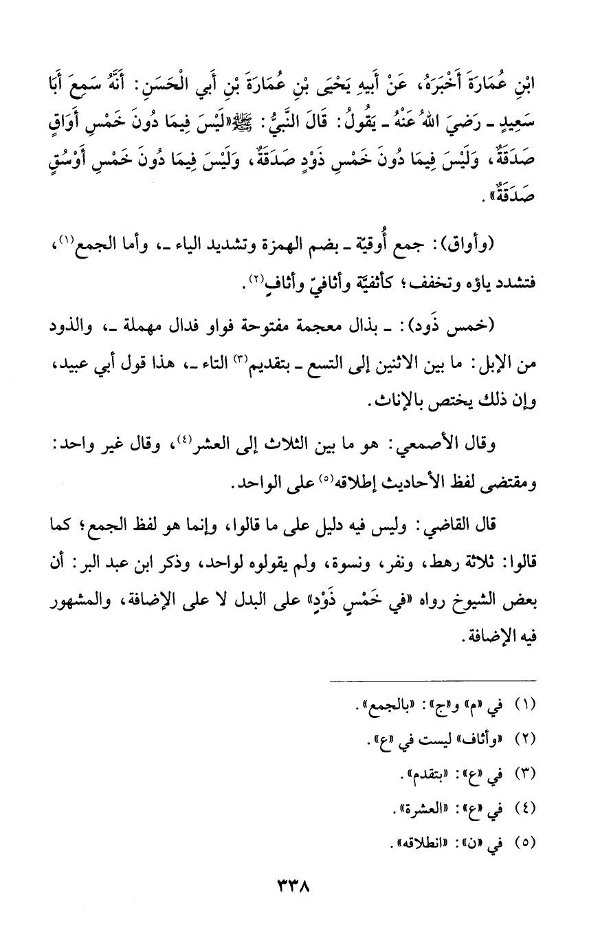 قال القاضي: وليس فيه دليل على ما قالوا، وإنما هو لفظ الجمع؛ كما قالوا: ثلاثة رهط، ونفر، ونسوة، ولم يقولوه لواحد، وذكر ابن عبد البر: أن بعض الشيوخ رواه "في خَمْسٍ ذَوْدٍ" على البدل لا على الإضافة، والمشهور فيه الإضافة.