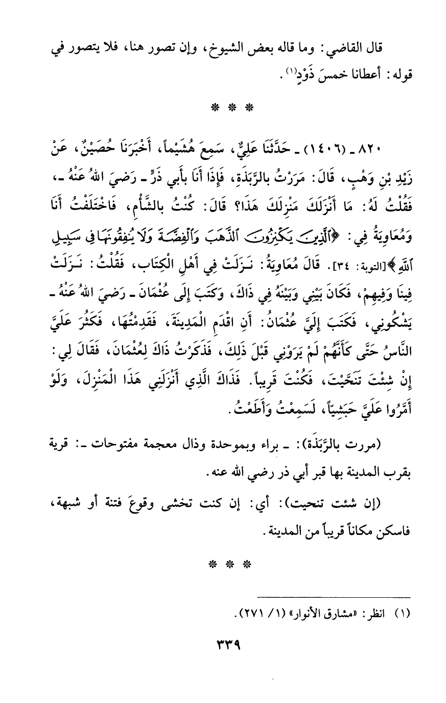 820 - (1406) - حَدَّثَنَا عَلِيٌّ، سَمِعَ هُشَيْماً، أَخْبَرَنَا حُصَيْن، عَنْ زيدِ بْنِ وَهْبٍ، قَالَ: مَرَرْتُ بالرَّبَذَةِ، فَإِذَا أَنَا بأَبي ذَرٍّ -رَضيَ اللهُ عَنْهُ-، فَقُلْتُ لَهُ: مَا أَنْزَلَكَ مَنْزِلَكَ هذَا؟ قَالَ: كُنْتُ بالشَّأْمِ، فَاخْتَلَفْتُ أَنَا وَمُعَاوِيَةُ فِي: {وَالَّذِينَ يَكْنِزُونَ الذَّهَبَ وَالْفِضَّةَ وَلَا يُنْفِقُونَهَا فِي سَبِيلِ اللَّهِ} [التوبة: 34]. قَالَ مُعَاوِيَةُ: نَزَلَتْ فِي أَهْلِ الْكِتَاب، فَقُلْتُ: نَزَلَتْ فِينَا وَفِيهم، فَكَانَ بَيْنِي وَبَيْنَهُ فِي ذَاكَ، وَكَتَبَ إِلَى عُثْمَانَ -رَضيَ اللهُ عَنْهُ- يَشْكُونِي، فَكَتَبَ إِلَيَّ عُثْمَانُ: أَنِ اقْدَمِ الْمَدِينَةَ، فَقَدِمتُها، فَكَثُرَ عَلَيَّ النَّاسُ حَتَّى كَأَنَّهُمْ لَمْ يَرَوني قَبْلَ ذَلِكَ، فَذَكرتُ ذَاكَ لِعُثْمَانَ، فَقَالَ لِي: إِنْ شِئْتَ تَنَحَّيْتَ، فَكُنْتَ قَرِيباً. فَذَاكَ الَّذِي أَنْزَلَنِي هذَا الْمَنزِلَ، وَلَوْ أَمَّرُوا عَلَيَّ حَبَشِيًّا، لَسَمِعتُ وَأَطَعتُ.