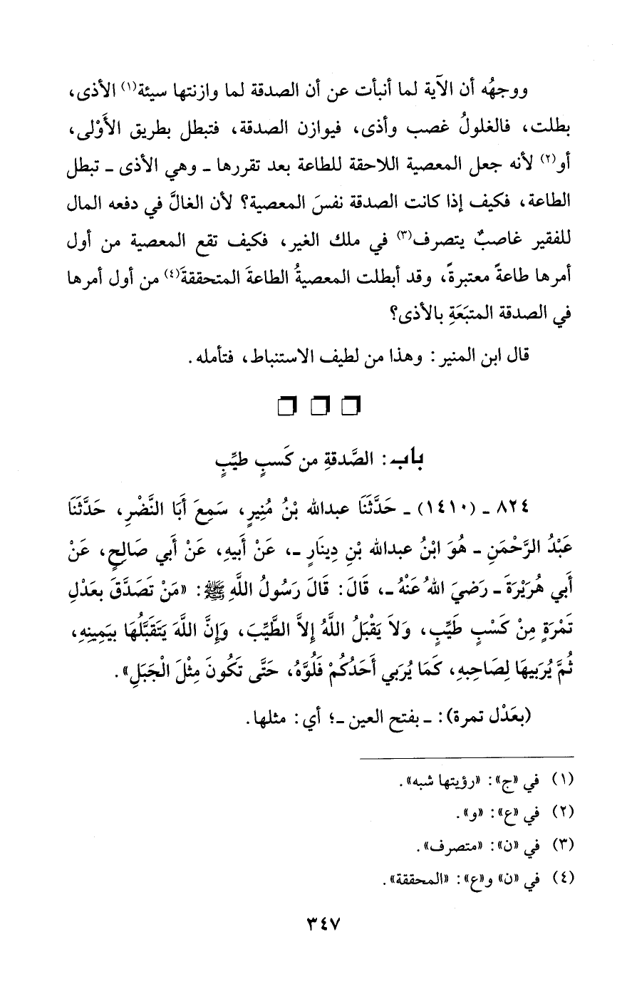 824 - (1410) - حَدَّثَنَا عبد الله بْنُ مُنِيرٍ، سَمِعَ أَبَا النَّضْرِ، حَدَّثَنَا عَبْدُ الرحمَنِ -هُوَ ابْنُ عبد الله بْنِ دِينَارٍ-، عَنْ أَبيهِ، عَنْ أَبي صَالحٍ، عَنْ أَبي هُرَيْرَةَ -رَضيَ اللهُ عَنْهُ-، قَالَ: قَالَ رَسُولُ اللَّهِ - صلى الله عليه وسلم -: "مَنْ تَصَدَّقَ بعَدْلِ تَمرَةٍ مِنْ كسْبٍ طَيِّبٍ، وَلاَ يَقْبَلُ اللَّهُ إلَّا الطَّيِّبَ، وَإِنَّ اللَّه يَتَقَبَّلها بيَمِينِهِ، ثُمَّ يُرَبيها لِصَاحِبهِ، كمَا يُرَبي أَحَدكم فَلُوَّهُ، حَتَّى تَكُونَ مِثْلَ الْجَبَل".