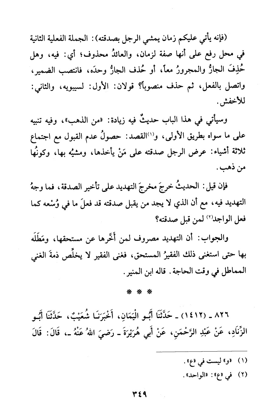 (فإنه يأتي عليكم زمان يمشي الرجل بصدقته): الجملة الفعلية الثانية في محل رفع على أنها صفة لزمان، والعائدُ محذوف؛ أي: فيه، وهل حُذفَ الجارُّ والمجرور معًا، أو حُذف الجارُّ وحدَه، فانتصب الضمير، واتصل بالفعل، ثم حذف منصوبا؛ قولان: الأول: لسيبويه، والثاني: للأخفش.