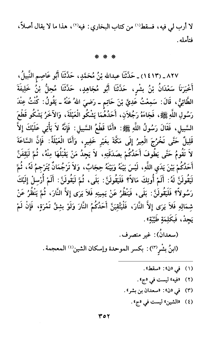 827 - (1413) - حَدَّثَنَا عبد الله بْنُ مُحَمَّدٍ، حَدَّثَنَا أَبُو عَاصم النَّبيلُ، أَخْبَرَنَا سَعْدَانُ بْنُ بشْرٍ، حَدَّثَنَا أَبُو مُجَاهِدٍ، حَدَّثَنَا مُحِلُّ بْنُ خَلِيفَةَ الطَّائِيُّ، قَالَ: سَمِعْتُ عَدِيَّ بْنَ حَاتِم -رَضيَ اللهُ عَنْهُ- يَقُولُ: كنْتُ عِنْدَ رَسُولِ اللَّهِ - صلى الله عليه وسلم -، فَجَاءَهُ رَجُلاَنِ، أَحَدُهُمَا يَشْكُو الْعَيْلَةَ، وَالآَخَرُ يَشْكُو قَطْعَ السَّبيلِ، فَقَالَ رَسُولُ اللهِ - صلى الله عليه وسلم -: "أَمَّا قَطْعُ السَّبيلِ: فَإِنَّهُ لَا يَأْتِي عَلَيْكَ إِلاَّ قَلِيل حَتَّى تَخْرُجَ الْعِيرُ إِلَى مَكَّةَ بغَيْرِ خَفِيرٍ، وَأَمَّا الْعَيْلَةُ: فَإِنَّ السَّاعَةَ لَا تَقُومُ حَتَّى يَطُوفَ أَحَدكُم بصَدَقَتِهِ، لَا يَجدُ مَنْ يَقْبَلُها مِنْهُ، ثُمَّ لَيَقِفَنَّ أَحَدكم بَيْنَ يَدَيِ اللَّهِ، لَيْسَ بَيْنَهُ وَبَيْنَهُ حِجَابٌ، وَلاَ تَرْجُمَان يُتَرْجِمُ لَهُ، ثُمَّ لَتقُولَنَّ لَهُ: أَلم أُوتِكَ مَالًا؟ فَلَيَقُولَنَّ: بَلَى، ثُمَّ لَيَقُولَنَّ: أَلَف أُرسِلْ إِلَيْكَ رَسُولاً؟ فَلَيَقُولَنَّ: بَلَى، فَيَنْظُرُ عَنْ يَمِينِهِ فَلاَ يَرَى إِلاَّ النَّارَ، ثُمَّ يَنْظُرُ عَنْ شِمَالِهِ فَلاَ يَرَى إِلأَ النَّارَ، فَلْيَتَّقِيَنَّ أَحَدكُمُ النَّارَ وَلَوْ بشِقِّ تَمرَةٍ، فَإِنْ لَمْ يَجدْ، فَبكَلِمَةٍ طَيِّبَةٍ".