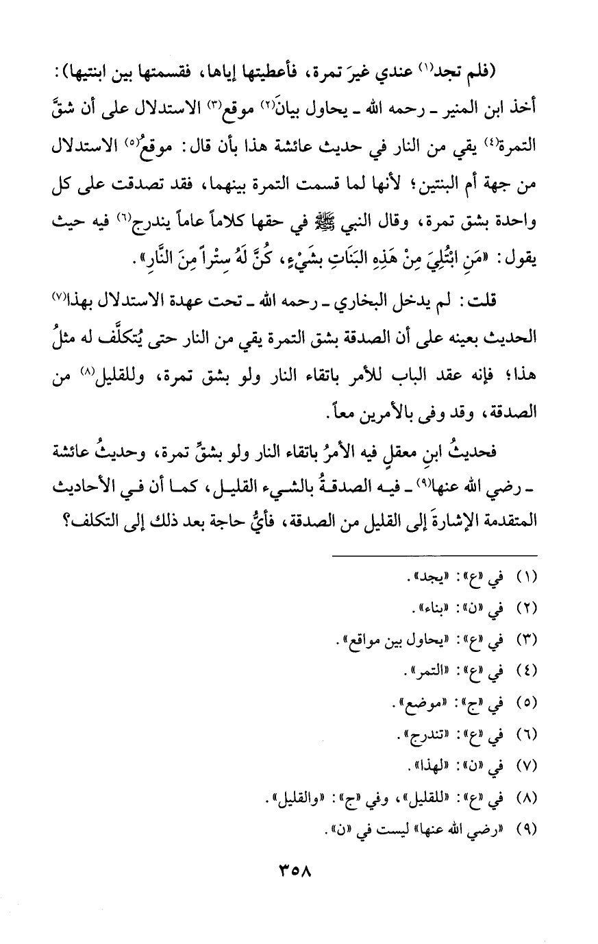 أخذ ابن المنير -رحمه الله- يحاول بيانَ (¬2) موقع (¬3) الاستدلال على أن شقَّ التمرة (¬4) يقي من النار في حديث عائشة هذا بأن قال: موقعُ (¬5) الاستدلال من جهة أم البنتين؛ لأنها لما قسمت التمرة بينهما، فقد تصدقت على كل واحدة بشق تمرة، وقال النبي - صلى الله عليه وسلم - في حقها كلاماً عاماً يندرج (¬6) فيه حيث يقول: "مَنِ ابْتُلِيَ مِنْ هذهِ البَنَاتِ بشَيْءٍ كُنَّ لَهُ سِتْراً مِنَ النَّارِ".