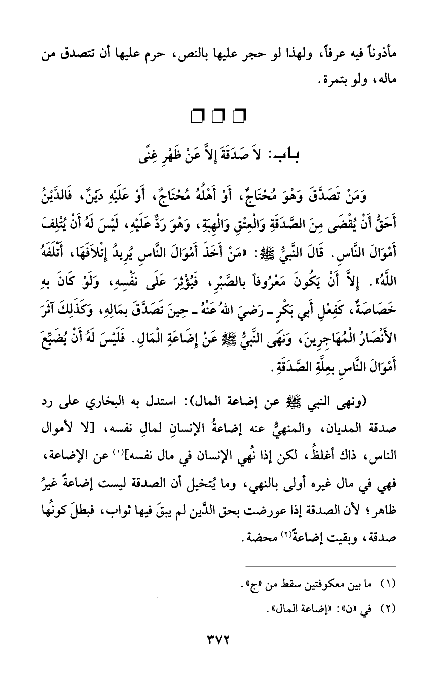 وَمَنْ تَصَدَّقَ وَهْوَ مُحْتَاج، أَوْ أَهْلُهُ مُحتَاجٌ، أَوْ عَلَيْهِ دَينٌ، فَالدَّيْنُ أَحَقُّ أَنْ يُقْضَى مِنَ الصَّدَقَةِ وَالْعِتْقِ وَالْهبةِ، وَهْوَ رَدٌّ عَلَيْهِ، لَيْسَ لَهُ أَنْ يُتْلِفَ أموَالَ النَّاسِ. قَالَ النَّبيُّ - صلى الله عليه وسلم -: "مَنْ أَخَذَ أَمْوَالَ النَّاسِ يُرِيدُ إِتْلاَفها، أتلَفَهُ اللَّهُ". إِلاَّ أَنْ يَكُونَ مَعْرُوفاً بالصَّبْرِ، فَيُؤثرَ عَلَى نفسِهِ، وَلَوْ كانَ بهِ خَصَاصَةٌ، كَفِعْلِ أَبي بَكْرٍ -رَضيَ اللهُ عَنْهُ- حِينَ تَصَدَّقَ بمَالِهِ، وَكَذَلِكَ آثَرَ الأَنْصَارُ الْمُهاجِرِينَ، وَنهى النَّبيُّ - صلى الله عليه وسلم - عَنْ إِضَاعَةِ الْمَالِ. فَلَيْسَ لَهُ أَنْ يُضَيِّعَ أَموَالَ النَّاسِ بعِلَّةِ الصَّدَقَةِ.