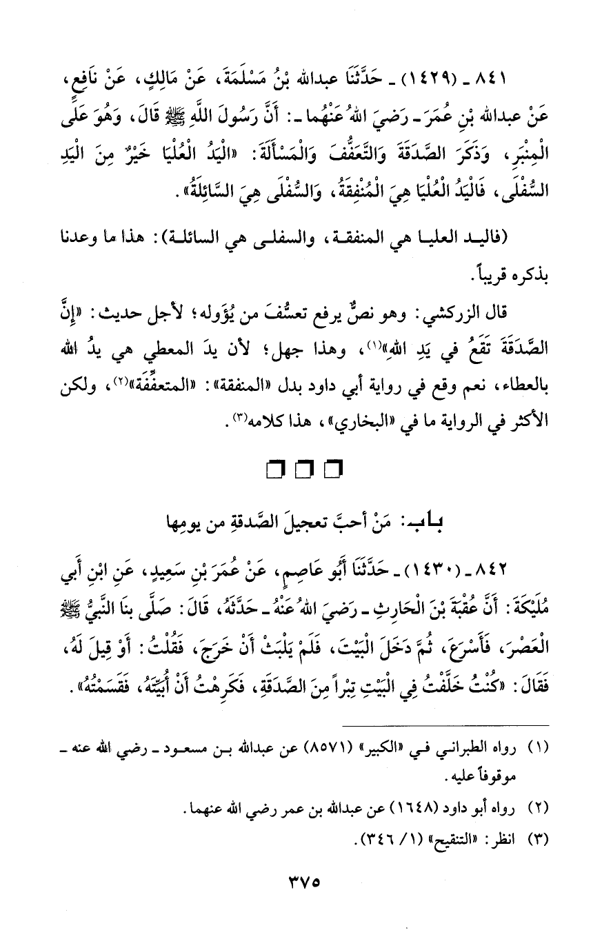 841 - (1429) - حَدَّثَنَا عبد الله بْنُ مَسْلَمَةَ، عَنْ مَالِكٍ، عَنْ نَافِعٍ، عَنْ عبد الله بْنِ عُمَرَ -رَضيَ اللهُ عَنْهُما-: أَنَّ رَسُولَ اللَّهِ - صلى الله عليه وسلم - قَالَ، وَهُوَ عَلَى الْمِنْبَرِ، وَذَكَرَ الصَّدَقَةَ وَالتَّعَفُّفَ وَالْمَسْأَلَةَ: "الْيَدُ الْعُلْيَا خَيْرٌ مِنَ الْيَدِ السُّفْلَى، فَالْيَدُ الْعُلْيَا هِيَ الْمُنْفِقَةُ، وَالسُّفْلَى هِيَ السَّائِلَةُ".