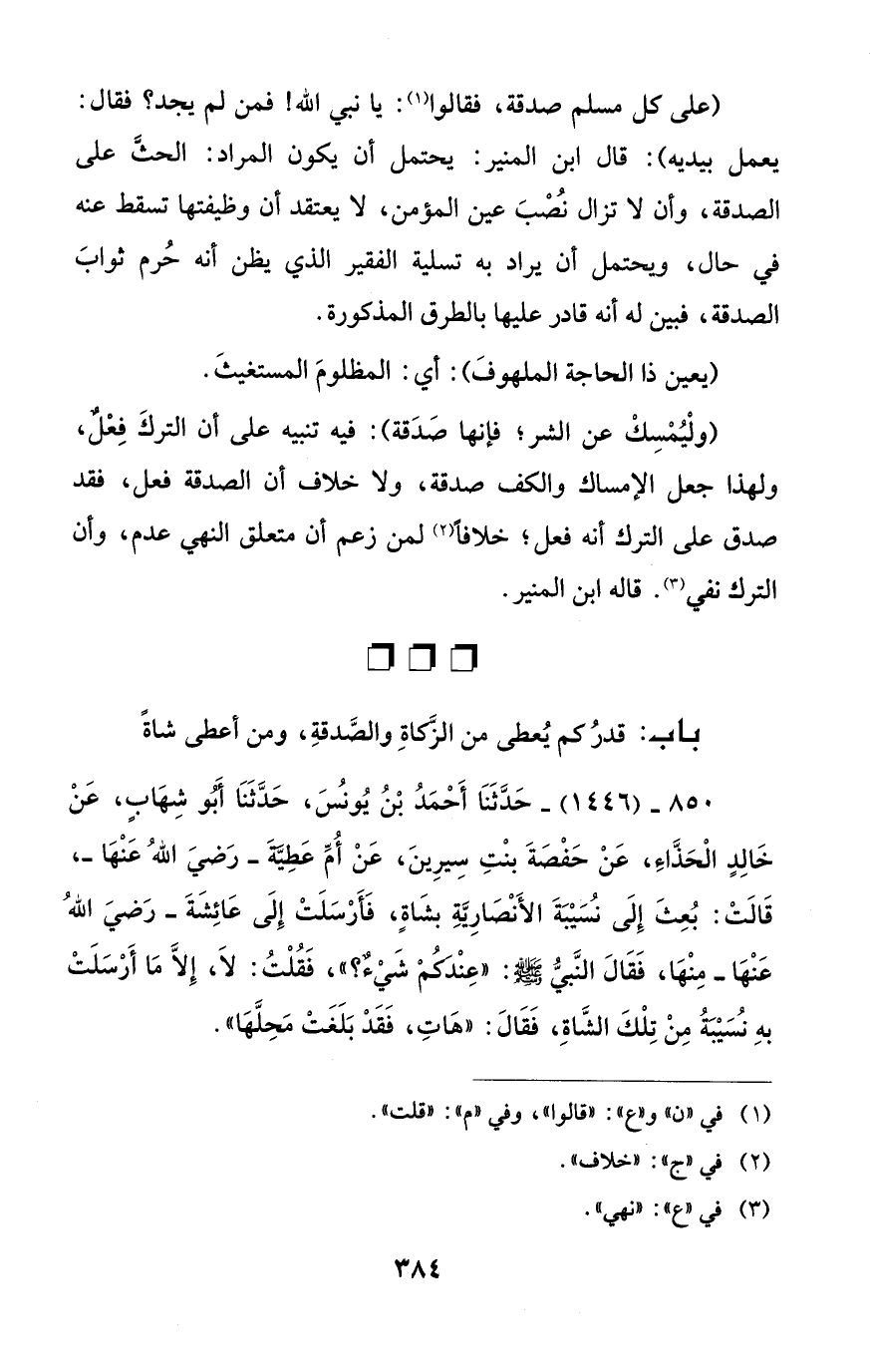 850 - (1446) - حَدَّثَنَا أَحمَدُ بْنُ يُونسُ، حَدَّثَنَا أَبُو شِهابٍ، عَنْ خَالِدٍ الْحَذَّاءَ، عَنْ حَفْصَةَ بنْتِ سِيرِينَ، عَنْ أُمِّ عَطِيَّة -رَضيَ اللهُ عَنْها-، قَالَتْ: بُعِثَ إِلَى نُسَيْبَةَ الأَنْصَارِيَّةِ بشَاةٍ، فَأَرْسَلَتْ إِلَى عَائِشَةَ -رَضيَ اللهُ عَنْها- مِنْها، فَقَالَ النَّبيُّ - صلى الله عليه وسلم -: "عِنْدكُم شَيْءٌ؟ "، فَقُلْتُ: لَا، إِلاَّ مَا أَرْسَلَتْ بهِ نُسَيْبَةُ مِنْ تِلْكَ الشَّاةِ، فَقَالَ: "هاتِ، فَقَد بَلَغَتْ مَحِلَّهَا".