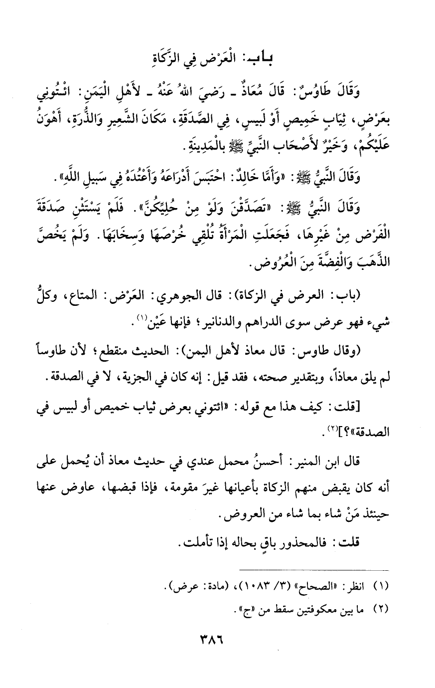 (باب: العرض في الزكاة): قال الجوهري: العَرْض: المتاع، وكلُّ شيء فهو عرض سوى الدراهم والدنانير؛ فإنها عَيْن (¬1).