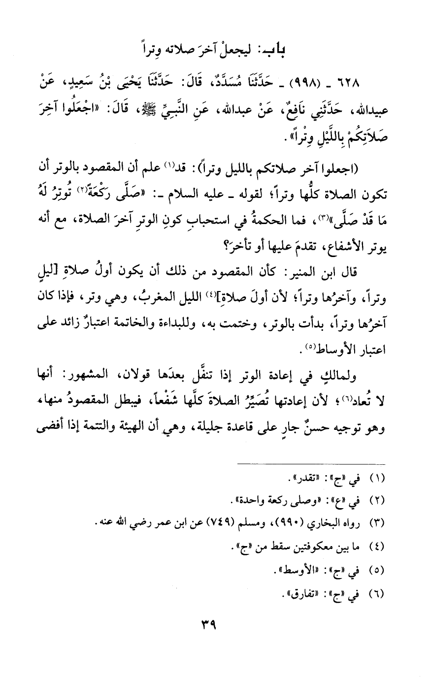 628 - (998) - حَدَثَنا مُسَدَدٌ، قَالَ: حَدَثَنا يَحْيىَ بْنُ سَعِيدٍ، عَنْ عبيد الله، حَدَّثَنِي نَافِعٌ، عَنْ عبد الله، عَنِ النَّبِيِّ - صلى الله عليه وسلم -، قَالَ: "اجْعَلُوا آخِرَ صَلاَتِكُمْ بِاللَّيْلِ وِتْرًا".