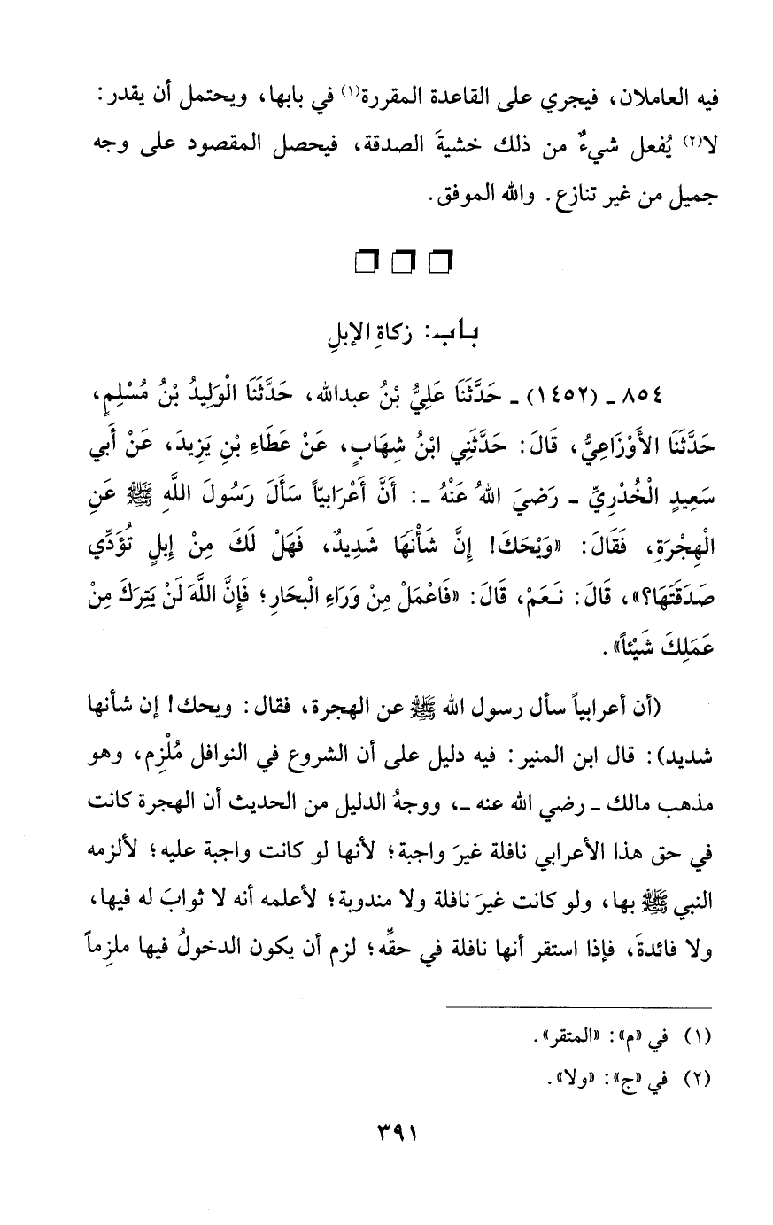 854 - (1452) - حَدَّثَنَا عَلِيُّ بْنُ عبد الله، حَدَّثَنَا الْوَليدُ بْنُ مُسْلِمٍ، حَدَّثَنَا الأَوْزَاعيُّ، قَالَ: حَدَّثَنِي ابْنُ شِهابٍ، عَنْ عَطَاءَ بْنِ يَزِيدَ، عنْ أَبي سَعِيدٍ الخُدرِيِّ -رَضيَ اللهُ عَنْهُ-: أَنَّ أَعرَابيًّا سأَلَ رَسُولَ اللَّهِ - صلى الله عليه وسلم - عنِ الْهِجْرَةِ، فَقَالَ: "وَيحَكَ! إِنَّ شأْنها شَدِيدٌ، فَهْلْ لَكَ مِنْ إِبلٍ تُؤَدِّى صَدَقتها؟ "، قَالَ: نَعَم، قَالَ: "فَاعمَلْ مِنْ وَرَاءِ الْبحَارِ؛ فَإِنَّ اللَّه لَنْ يترَكَ مِنْ عَمَلِكَ شَيئاً".