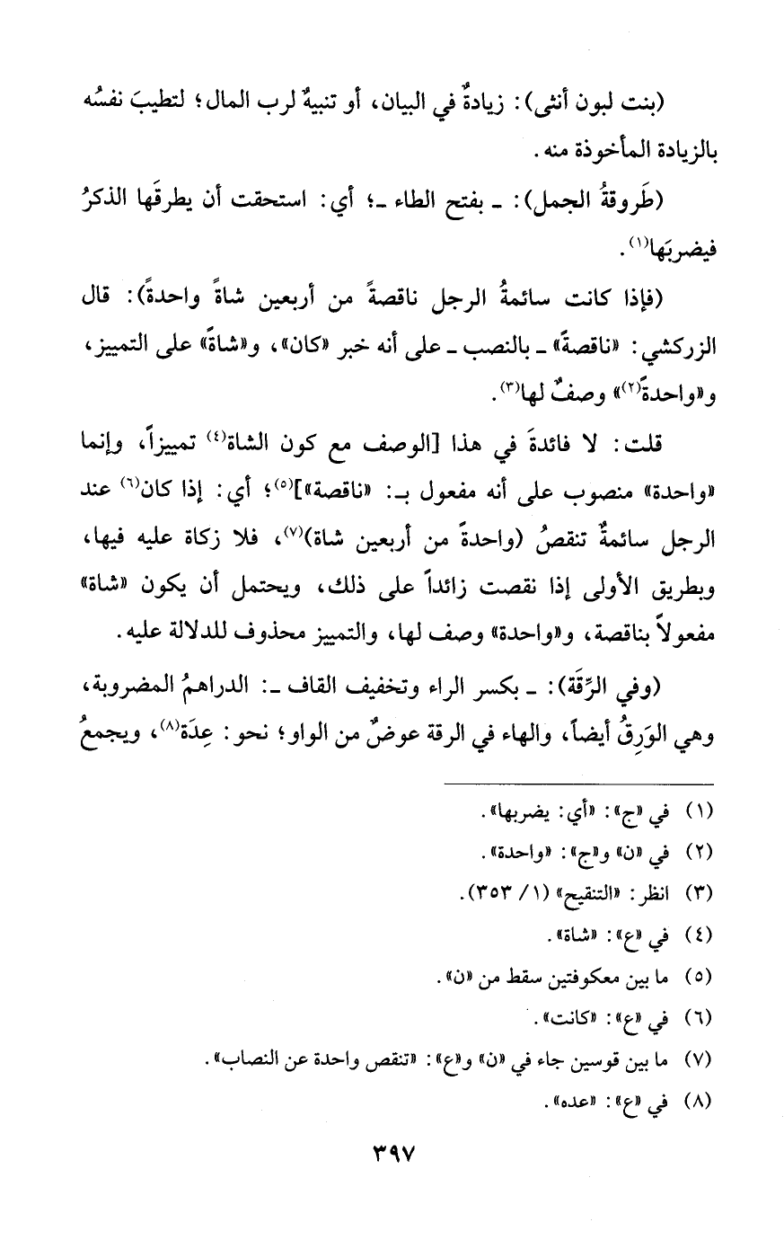 (¬7) ما بين قوسين جاء في "ن" و"ع": "تنقص واحدة عن النصاب".