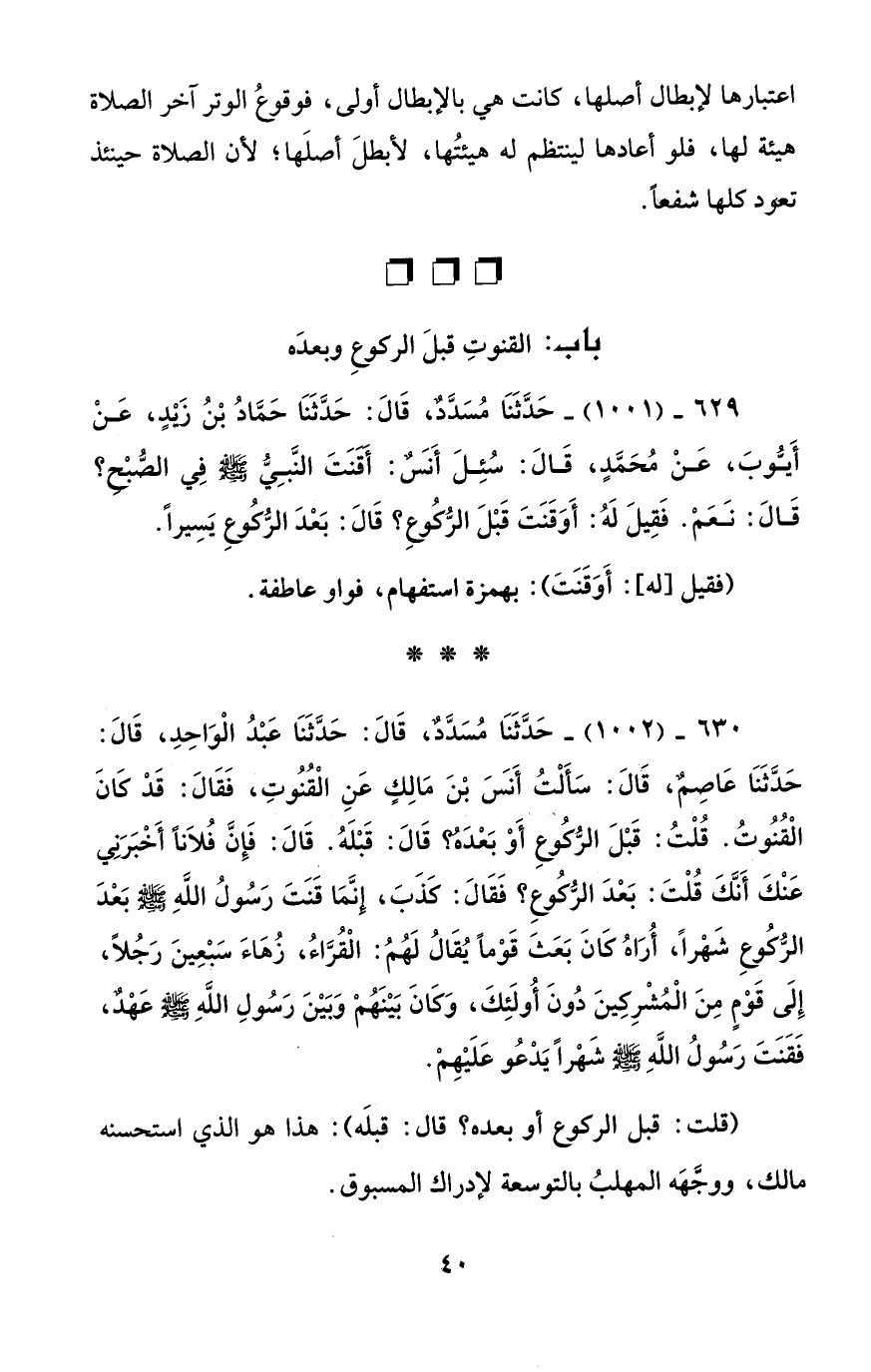 629 - (1001) - حدثنا مُسَدَّدٌ، قَالَ: حَدَّثَنا حَمّادُ بْنُ زيدٍ، عَنْ أَيُّوبَ، عَنْ مُحَمَّدٍ، قَالَ: سُئِلَ أَنسٌ: أقنَتَ النَّبِيُّ -صلى الله عليه وسلم- في الصُّبْح؟ قَالَ: نَعَمْ. فَقِيلَ لَهُ: أَوَقَنَتَ قَبْلَ الرُّكوعِ؟ قَالَ: بَعْدَ الرُّكوعِ يَسِيرًا.