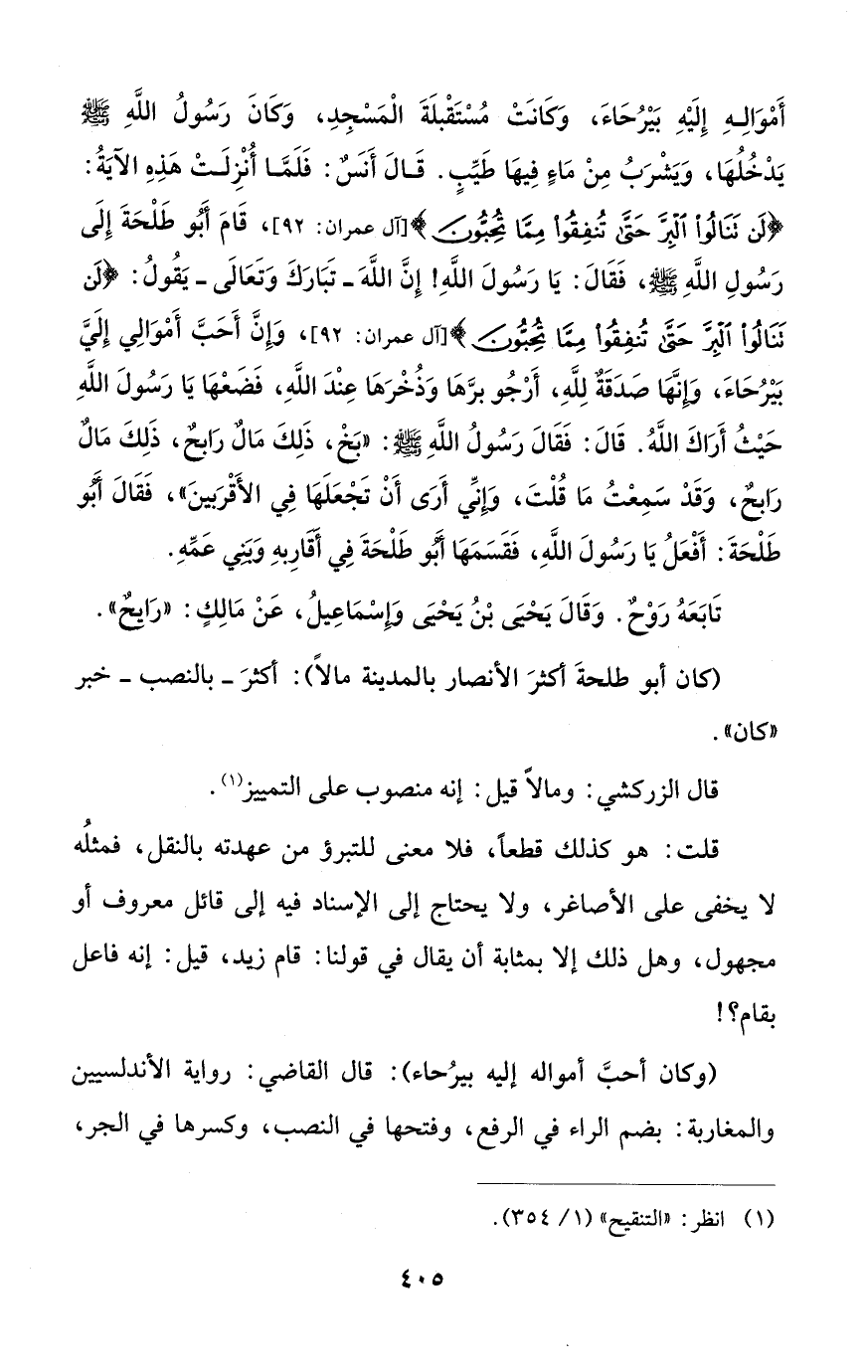 قلت: هو كذلك قطعاً، فلا معنى للتبرؤ من عهدته بالنقل، فمثلُه لا يخفى على الأصاغر، ولا يحتاج إلى الإسناد فيه إلى قائل معروف أو مجهول، وهل ذلك إلا بمثابة أن يقال في قولنا: قام زيد، قيل: إنه فاعل بقام؟! (وكان أحبَّ أمواله إليه بيرُحاء): قال القاضي: رواية الأندلسيين والمغاربة: بضم الراء في الرفع، وفتحها في النصب، وكسرها في الجر،