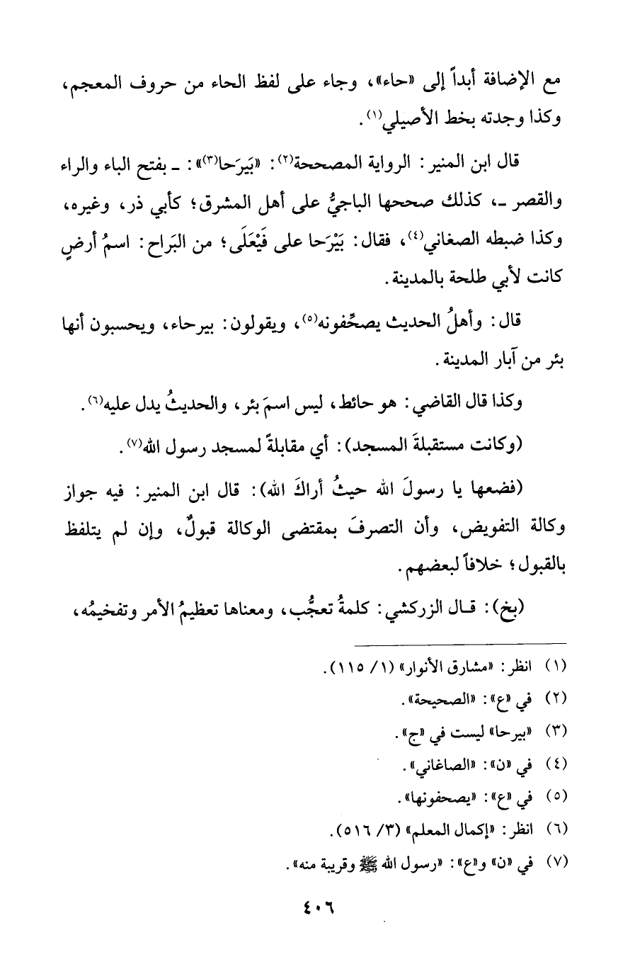 قال ابن المنير: الرواية المصححة (¬2): "بَيرَحا (¬3) ": -بفتح الباء والراء والقصر-، كذلك صححها الباجيُّ على أهل المشرق؛ كأبي ذر، وغيره، وكذا ضبطه الصغاني (¬4)، فقال: بَيْرَحا على فَيْعَلَى؛ من البَراح: اسمُ أرضٍ كانت لأبي طلحة بالمدينة.