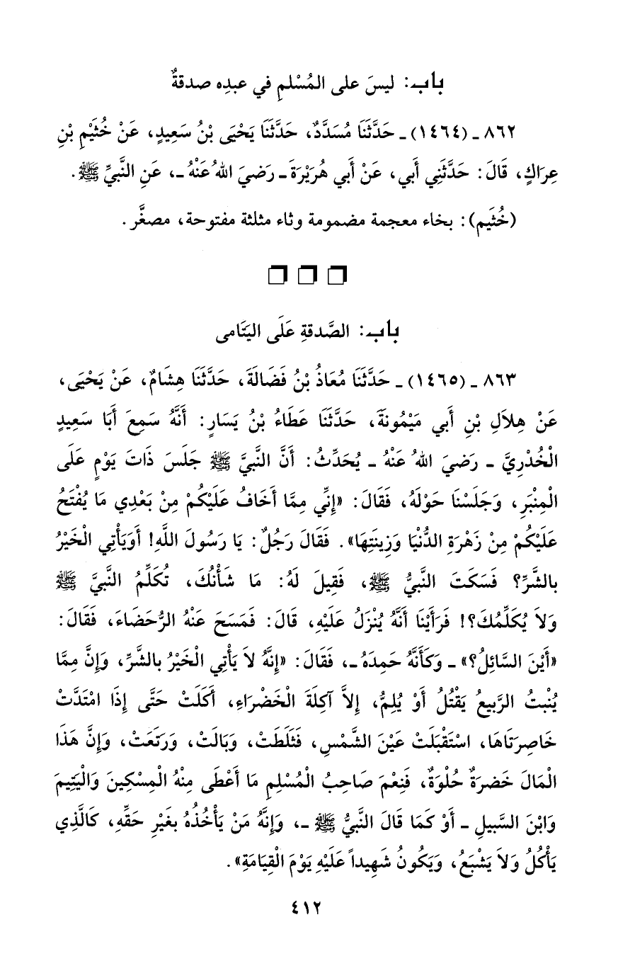 863 - (1465) - حَدَّثَنَا مُعَاذُ بْنُ فَضَالَةَ، حَدَّثَنَا هِشَامٌ، عَنْ يَحيَى، عَنْ هِلاَلِ بْنِ أَبي مَيْمُونَةَ، حَدَّثَنَا عَطَاءُ بْنُ يَسَارٍ: أَنَّهُ سَمِعَ أَبَا سَعِيدٍ الْخدرِيَّ -رَضيَ اللهُ عَنْهُ- يُحَدِّثُ: أَنَّ النَّبيَّ - صلى الله عليه وسلم - جَلَسَ ذَاتَ يَوْمٍ عَلَى الْمِنْبَرِ، وَجَلَسْنَا حَوْلَهُ، فَقَالَ: "إِنِّي مِمَّا أَخَافُ عَلَيْكُم مِنْ بَعدِي مَا يُفْتَحُ عَلَيْكُم مِنْ زَهْرَةِ الدُّنْيَا وَزِينَتِها". فَقَالَ رَجُل: يَا رَسُولَ اللَّهِ! أَوَ يَأتِي الْخَيْرُ بالشَّرِّ؟ فَسَكَتَ النَّبيُّ - صلى الله عليه وسلم -، فَقِيلَ لَهُ: مَا شَأْنُكَ، تُكَلِّمُ النَّبيَّ - صلى الله عليه وسلم - وَلاَ يُكَلِّمُكَ؟! فَرَأَيْنَا أَنَّهُ يُنْزَلُ عَلَيْهِ، قَالَ: فَمَسَحَ عَنْهُ الرُّحَضَاءَ، فَقَالَ: "أَيْنَ السَّائِلُ؟ " -وَكَأَنَّهُ حَمِدَهُ-، فَقَالَ: "إِنَّهُ لَا يَأتِي الْخَيْرُ بالشَّرِّ، وَإِنَّ مِمَّا يُنْبتُ الرَّبيعُ يَقْتُلُ أَوْ يُلِمُّ، إِلاَّ آكِلَةَ الْخَضْرَاءِ، أكلَتْ حَتَّى إِذَا امتَدَّتْ خَاصِرَتَاها، اسْتَقْبَلَتْ عَيْنَ الشَّمسِ، فَثَلَطَتْ، وَبَالَتْ، وَرتَعَتْ، وَإِنَّ هذَا الْمَالَ خَضرَةٌ حُلْوَةٌ، فَنِعمَ صَاحِبُ الْمُسْلِم مَا أَعْطَى مِنْهُ الْمِسْكِينَ وَالْيتيمَ وَابْنَ السَّبيلِ -أَوْ كَمَا قَالَ النَّبيُّ صلى الله عليه وسلم-، وَإِنَّهُ مَنْ يَأْخُذُهُ بغَيْرِ حَقِّهِ، كَالَّذِي يَأكلُ وَلاَ يَشْبَعُ، وَيَكُونُ شَهِيداً عَلَيْهِ يَوْمَ الْقِيَامَةِ".