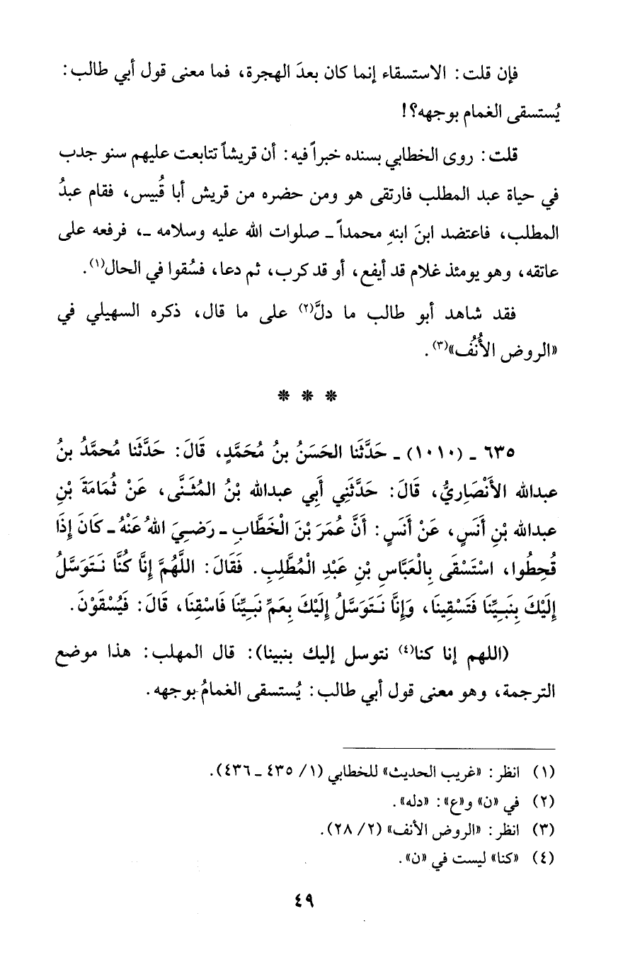 635 - (1010) - حَدَّثَنا الحَسَنُ بنُ مُحَمَّدٍ، قَالَ: حَدَّثَنا مُحمَّدُ بنُ عبد الله الأَنْصاِريُّ، قَالَ: حَدَّثَنِي أَبِي عبد الله بْنُ المُثَنَّى، عَنْ ثُمامَةَ بْنِ عبد الله بْنِ أَنسٍ، عَنْ أَنسٍ: أَنَّ عُمَرَ بْنَ الْخَطّابِ -رَضِيَ اللهُ عَنْهُ- كانَ إِذا قُحِطُوا، اسْتَسْقَى بِالْعَبّاسِ بْنِ عَبْدِ الْمُطَّلِبِ. فَقالَ: اللهُمَّ إِنّا كُنّا نَتَوَسَّلُ إِلَيْكَ بِنَبِيِّنا فتسْقِينا، وَإِنّا نَثَوَسَّلُ إِلَيْكَ بِعَمِّ نبِيِّنا فاسْقِنا، قَالَ: فَيُسْقَوْنَ.