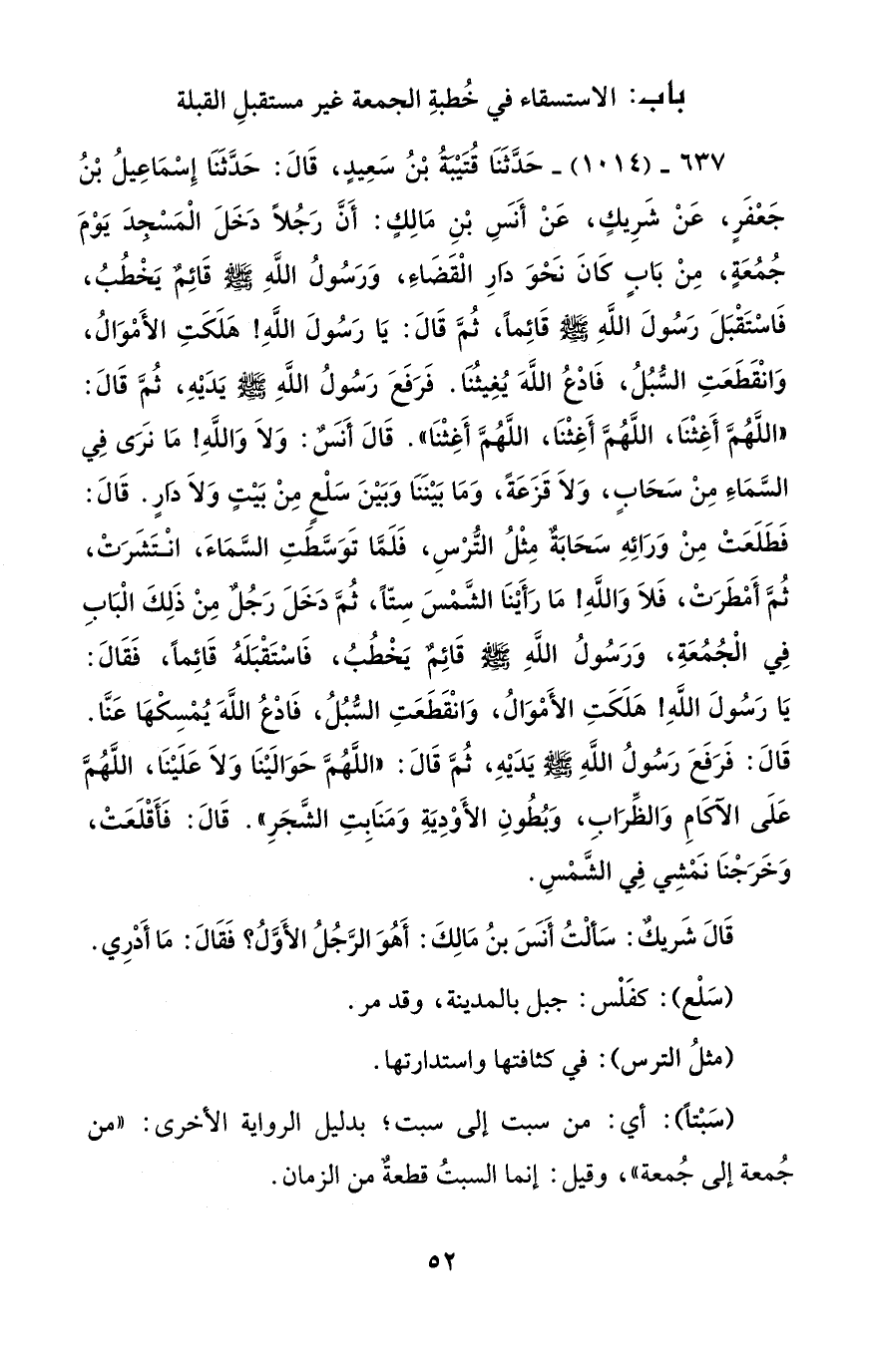 637 - (1014) - حَدَّثَنا قُتَيْبةُ بْنُ سَعِيدٍ، قَالَ: حَدَّثَنا إِسْماعِيلُ بْنُ جَعْفَرٍ، عَنْ شَرِيكٍ، عَنْ أَنسِ بْنِ مالِكٍ: أَنَّ رَجُلًا دَخَلَ الْمَسْجدَ يَوْمَ جُمُعَةٍ، مِنْ بابٍ كانَ نحوَ دارِ الْقَضاءِ، وَرَسُولُ اللهِ - صلى الله عليه وسلم - قائِمٌ يَخْطُبُ، فاسْتَقْبَلَ رَسُولَ اللهِ - صلى الله عليه وسلم - قائِمًا، ثُمَّ قَالَ: يا رَسُولَ اللهِ! هَلَكَتِ الأَمْوالُ، وانْقَطَعَتِ السُّبُلُ، فادْعُ اللهَ يُغِيثُنا. فَرَفَعَ رَسُولُ اللهِ - صلى الله عليه وسلم - يَدَيْهِ، ثُمَّ قَالَ: "اللَّهُمَّ أغِثْنا، اللهُمَّ أغِثْنا، اللهُمَّ أغِثْنا". قَالَ أَنسٌ: وَلا واللهِ! ما نَرَى في السَّماءِ مِنْ سَحابٍ، وَلا قَزَعَةً، وَما بَيْنَنا وَبَيْنَ سَلْعٍ مِنْ بَيْتٍ وَلا دارٍ. قَالَ: فَطَلَعَتْ مِنْ وَرائِهِ سَحابَةٌ مِثْلُ التُّرْسِ، فَلَمَّا تَوَسَّطَتِ السَّماءَ، انْتَشَرَتْ، ثُمَّ أَمْطَرَتْ، فَلا واللهِ! ما رَأَينا الشَّمسَ سِتًّا، ثُمَّ دَخَلَ رَجُلٍ مِنْ ذَلِكَ الْبابِ في الْجُمُعَةِ، وَرَسُولُ الله - صلى الله عليه وسلم - قائمٌ يَخْطُبُ، فاسْتَقْبَلَهُ قائِمًا، فَقالَ: يا رَسُولَ اللهِ! هَلَكَتِ الأَمْوالُ، وانْقَطَعَتِ السُّبُلُ، فادع اللهَ يُمْسِكْها عَنَّا. قَالَ: فَرَفَعَ رَسُولُ اللهِ - صلى الله عليه وسلم - يَدَيْهِ، ثُمَّ قَالَ: "اللَّهُمَّ حَوالَيْنا وَلا عَلَيْنا، اللهُمَّ عَلَى الآكامِ والظِّرابِ، وَبُطُونِ الأَوْدِيَةِ وَمَنابِتِ الشَّجَرِ". قَالَ: فَأَقْلَعَتْ، وَخَرَجْنا نَمْشِي في الشَّمْسِ.