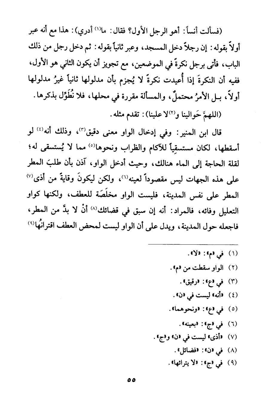 قال ابن المنير: وفي إدخال الواو معنى دقيق (¬3)، وذلك أنَّه (¬4) لو أسقطها، لكان مستسقِياً للآكام والظراب ونحوها (¬5) مما لا يُستسقى له؛ لقلة الحاجة إلى الماء هنالك، وحيث أدخل الواو، آذن بأن طلبَ المطر على هذه الجهات ليس مقصودًا لعينه (¬6)، ولكن ليكونَ وقايةً من أذى (¬7) المطر على نفس المدينة، فليست الواو مخلَصَة للعطف، ولكنها كواو التعليل وفائه، فالمراد: أنَّه إن سبق في قضائك (¬8) أنْ لا بدَّ من المطر، فاجعله حول المدينة، ويدل على أن الواو ليست لمحض العطف اقترانهُا (¬9)