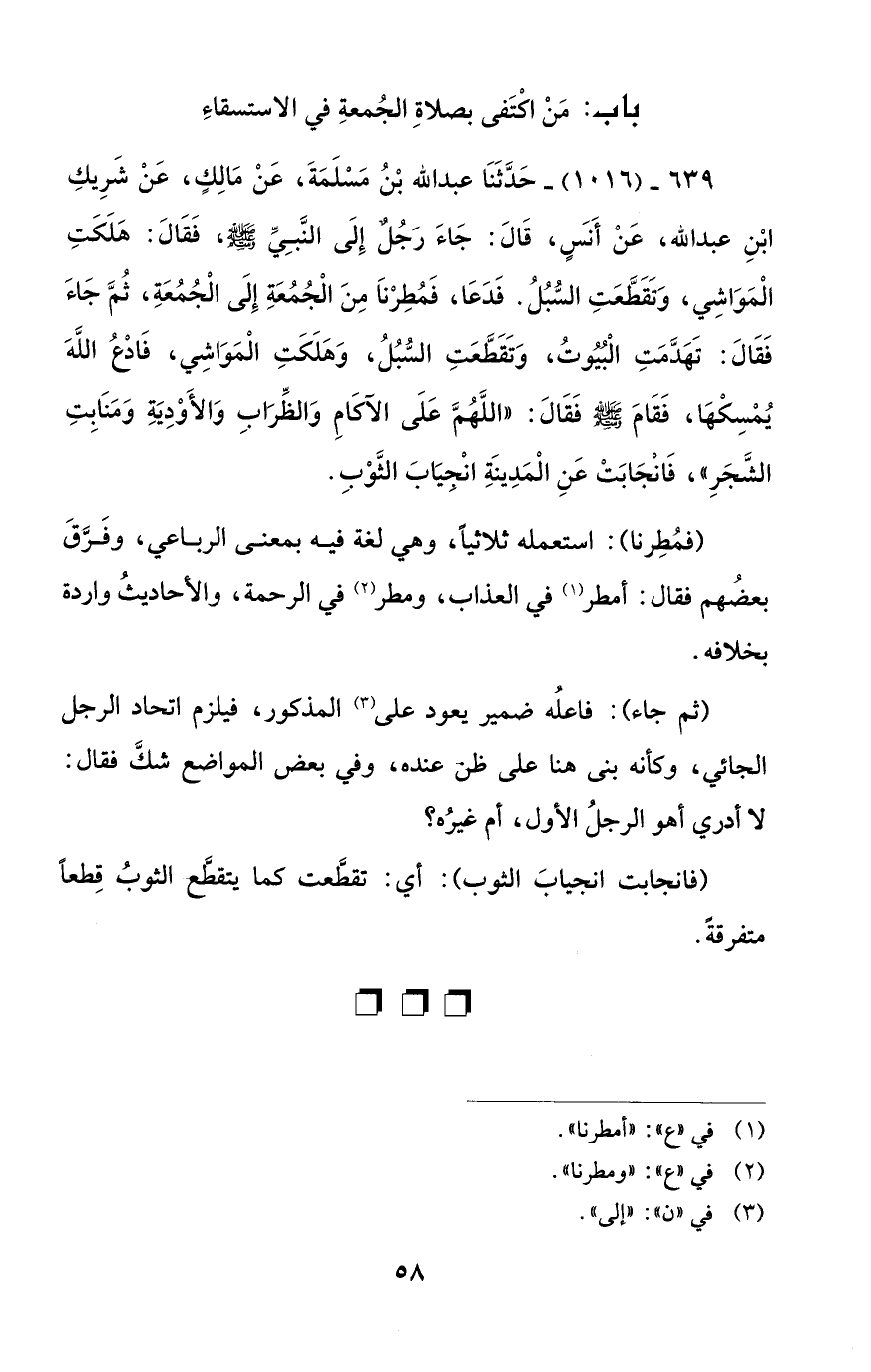 639 - (1016) - حَدَّثَنا عبد الله بْنُ مَسْلَمَةَ، عَنْ مالِكٍ، عَنْ شَرِيكِ ابْنِ عبد الله، عَنْ أَنسِ، قَالَ: جاءَ رَجُلٌ إِلَى النَّبِيِّ - صلى الله عليه وسلم -، فَقالَ: هَلَكَتِ الْمَواشِي، وَتَقَطَّعَتِ السُّبُلُ. فَدَعا، فَمُطِرنا مِنَ الْجُمُعَةِ إِلَى الْجُمُعَةِ، ثُمَّ جاءَ فَقالَ: تَهَدَّمَتِ الْبُيُوتُ، وَتَقَطَّعَتِ السُّبُلُ، وَهَلَكَتِ الْمَواشِي، فادع اللهَ يمسِكْها، فَقامَ - صلى الله عليه وسلم - فَقالَ: "اللهُمَّ عَلَى الآكامِ والظِّرابِ والأَوْدِيَةِ وَمَنابِتِ الشَّجَرِ"، فانْجابَتْ عَنِ الْمَدِينَةِ انْجيابَ الثَّوْبِ.