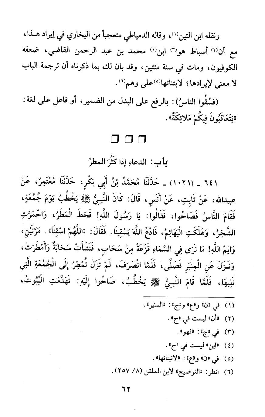 641 - (1021) - حَدَّثَنا مُحَمَّدُ بْنُ أَبِي بَكْرٍ، حَدّثَنا مُعْتَمِرٌ، عَنْ عبيد الله، عَنْ ثابِتٍ، عَنْ أَنسٍ، قَالَ: كانَ النَّبِيُّ -صلى الله عليه وسلم- يَخْطُبُ يَوْمَ جُمُعَةٍ، فَقامَ النّاسُ فَصاحُوا، فَقالُوا: يا رَسُولَ اللهِ! قَحَطَ الْمَطَرُ، واحمَرَّتِ الشَّجَرُ، وَهَلَكَتِ الْبَهائِمُ، فادع اللهَ يَسْقِينا. فَقالَ: "اللهُمَّ اسْقِنا". مَرَّتَيْنِ، وايْمُ اللهِ! ما نَرَى في السَّماءَ قَزَعَةً مِنْ سَحابٍ، فَنَشَأَتْ سَحابَةٌ وَأَمْطَرَتْ، وَنَزَلَ عَنِ الْمِنْبَرِ فَصَلَّى، فَلَمّا انْصَرَفَ، لَمْ تَزَلْ تُمْطِرُ إِلَى الْجُمُعَةِ الَّتِي تَلِيها، فَلَمّا قامَ النَّبِيّ - صلى الله عليه وسلم - يَخْطُبُ، صاحُوا إِلَيْهِ: تَهَدَّمَتِ الْبُيُوتُ،