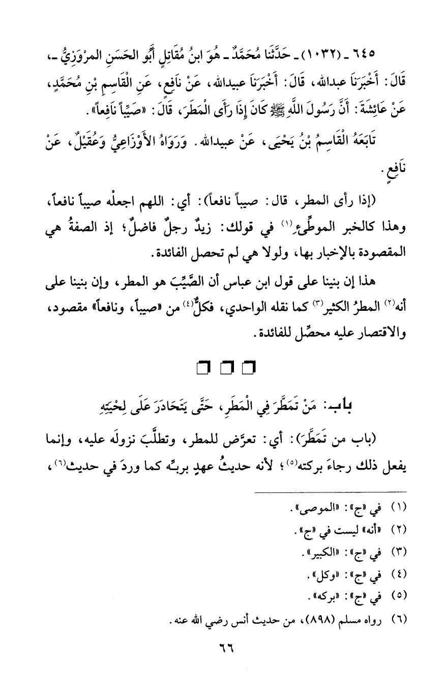 645 - (1032) - حَدَّثَنا مُحَمَّد -هُوَ ابنُ مُقاتِلٍ أبو الحَسَنِ المروَزِيُّ-، قَالَ: أَخْبَرَنا عبد الله، قَالَ: أَخْبَرَنا عبيد الله، عَنْ نَافِعٍ، عَنِ الْقاسِم بْنِ مُحَمَّدٍ، عَنْ عائِشَةَ: أَنَّ رَسُولَ اللهِ - صلى الله عليه وسلم - كانَ إِذا رَأَى الْمَطَرَ، قَالَ: "صَيِّبًا نَافِعًا".