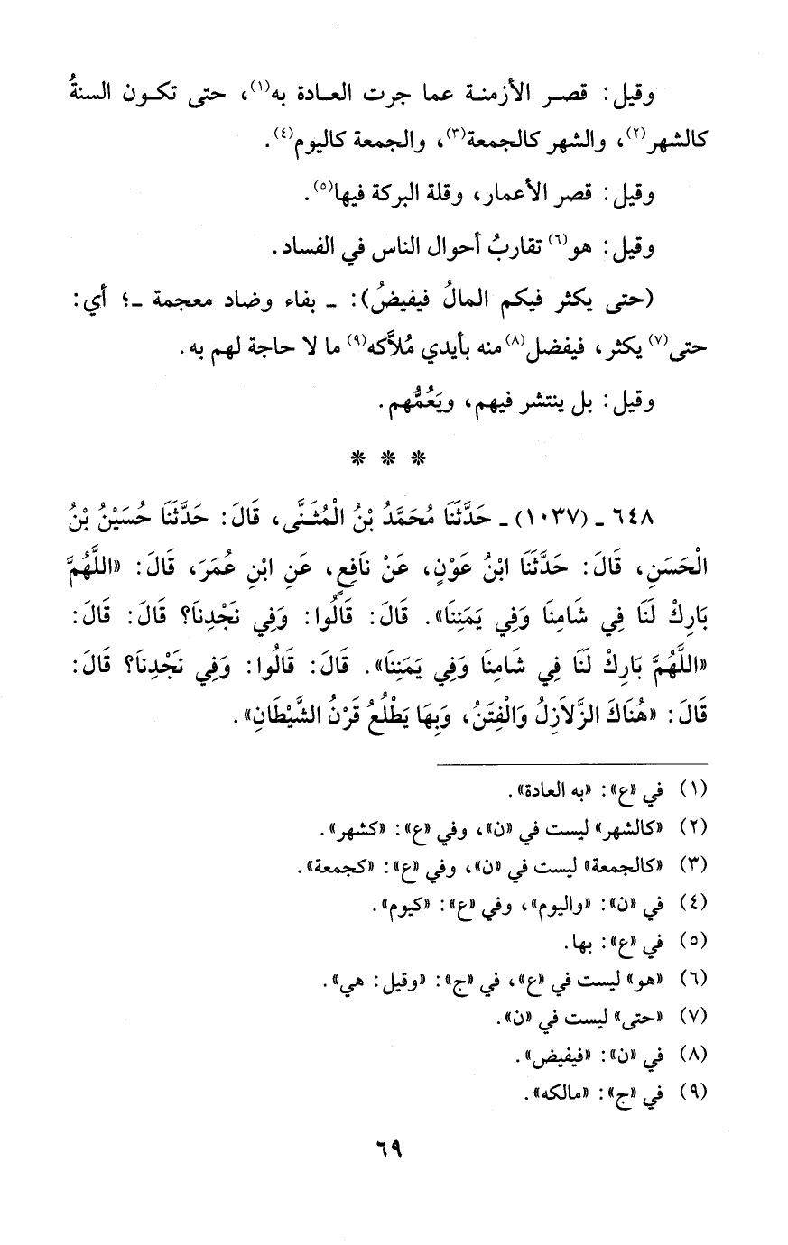648 - (1037) - حَدَّثَنا مُحَمَّدُ بْنُ الْمُثَنَّى، قَالَ: حَدَّثَنا حُسَيْنُ بْنُ الْحَسَنِ، قَالَ: حَدَّثَنا ابْنُ عَوْنٍ، عَنْ نَافِعٍ، عَنِ ابْنِ عُمَرَ، قَالَ: "اللهُمَّ بارِكْ لَنا في شامِنا وَفِي يَمَنِنَا". قَالَ: قالُوا: وَفِي نَجْدِنَا؟ قَالَ: قَالَ: "اللهُمَّ بارِكْ لَنا في شامِنا وَفِي يَمَنِنا". قَالَ: قالُوا: وَفِي نَجْدِنَا؟ قَالَ: قَالَ: "هُناكَ الزَّلاَزِلُ والْفِتَنُ، وَبِها يَطْلُعُ قَرْنُ الشَّيْطانِ".