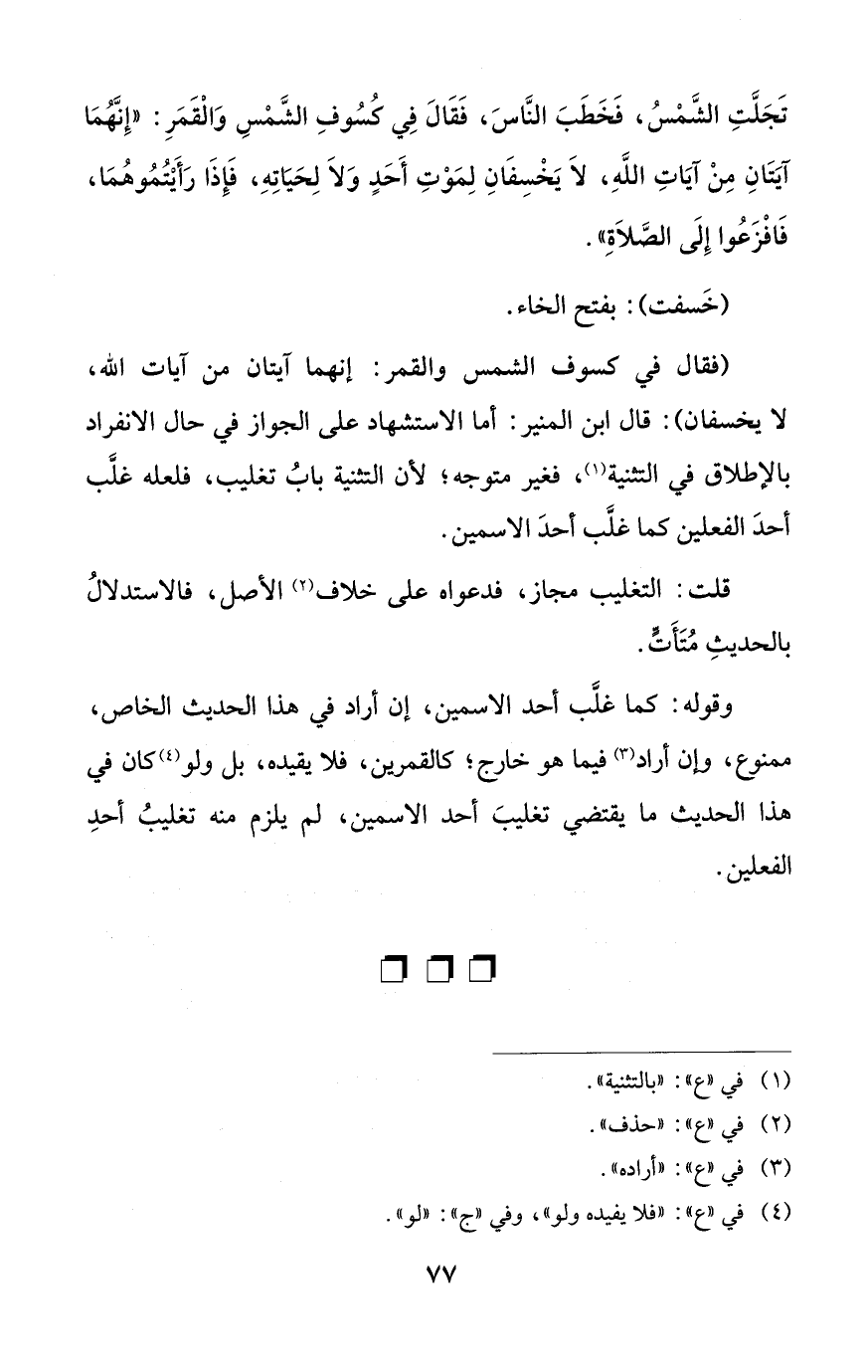 (فقال في كسوف الشمس والقمر: إنهما آيتان من آيات الله، لا يخسفان): قال ابن المنير: أما الاستشهاد على الجواز في حال الانفراد بالإطلاق في التثنية (¬1)، فغير متوجه؛ لأنَّ التثنية بابُ تغليب، فلعله غلَّب أحدَ الفعلين كما غلَّب أحدَ الاسمين.
