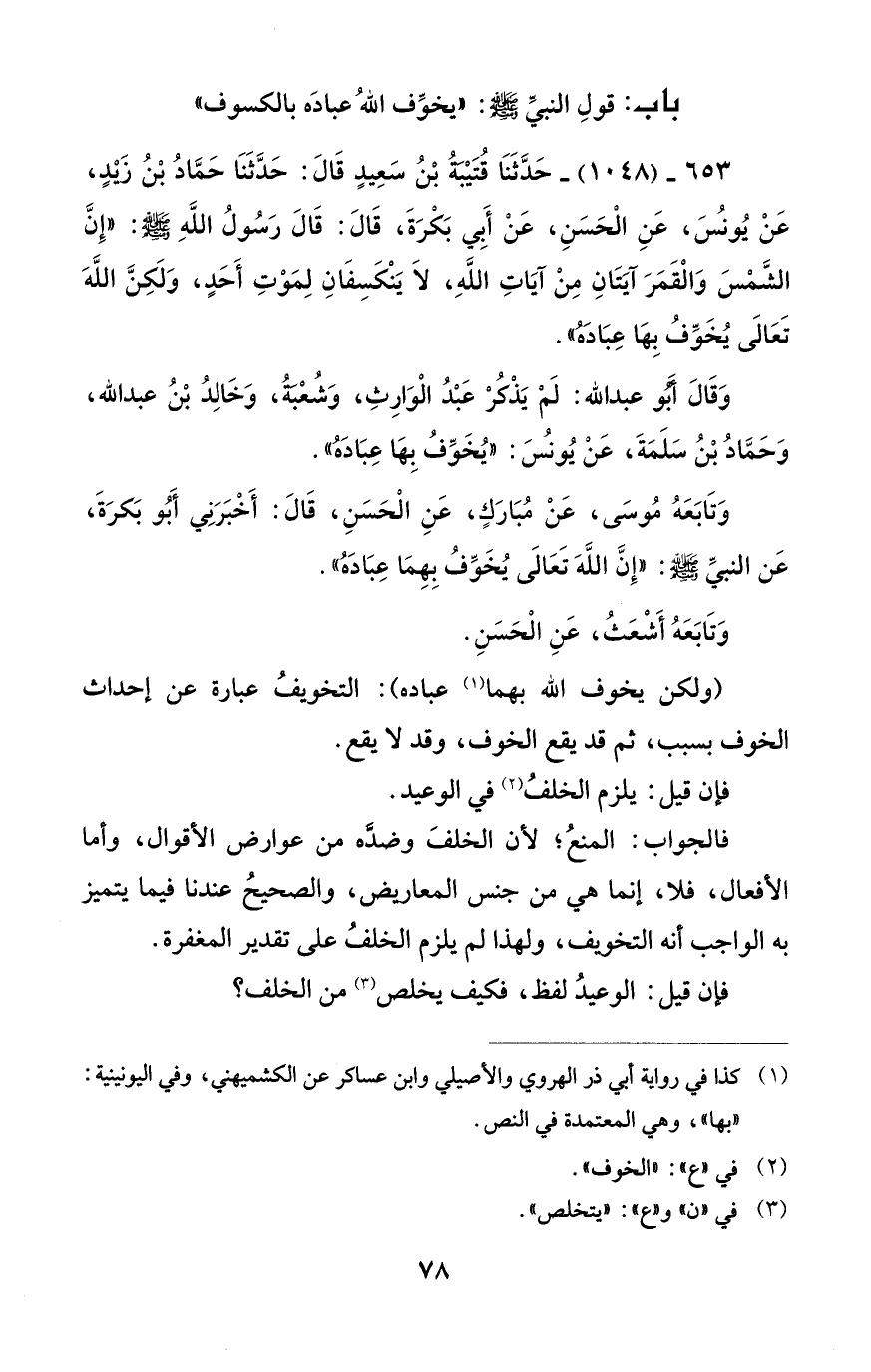 653 - (1048) - حَدَّثَنا قُتَيْتةُ بْنُ سَعِيدٍ قَالَ: حَدَّثَنا حَمّادُ بْنُ زَيْدٍ، عَنْ يُونسَ، عَنِ الْحَسَنِ، عَنْ أَبِي بَكْرَةَ، قَالَ: قَالَ رَسُولُ اللهِ - صلى الله عليه وسلم -: "إِنَّ الشَّمْسَ والْقَمَرَ آيَتانِ مِنْ آياتِ اللهِ، لا يَنْكَسِفانِ لِمَوْتِ أَحَدٍ، وَلَكِنَّ اللهَ تَعالَى يُخَوِّفُ بِها عِبادَهُ".