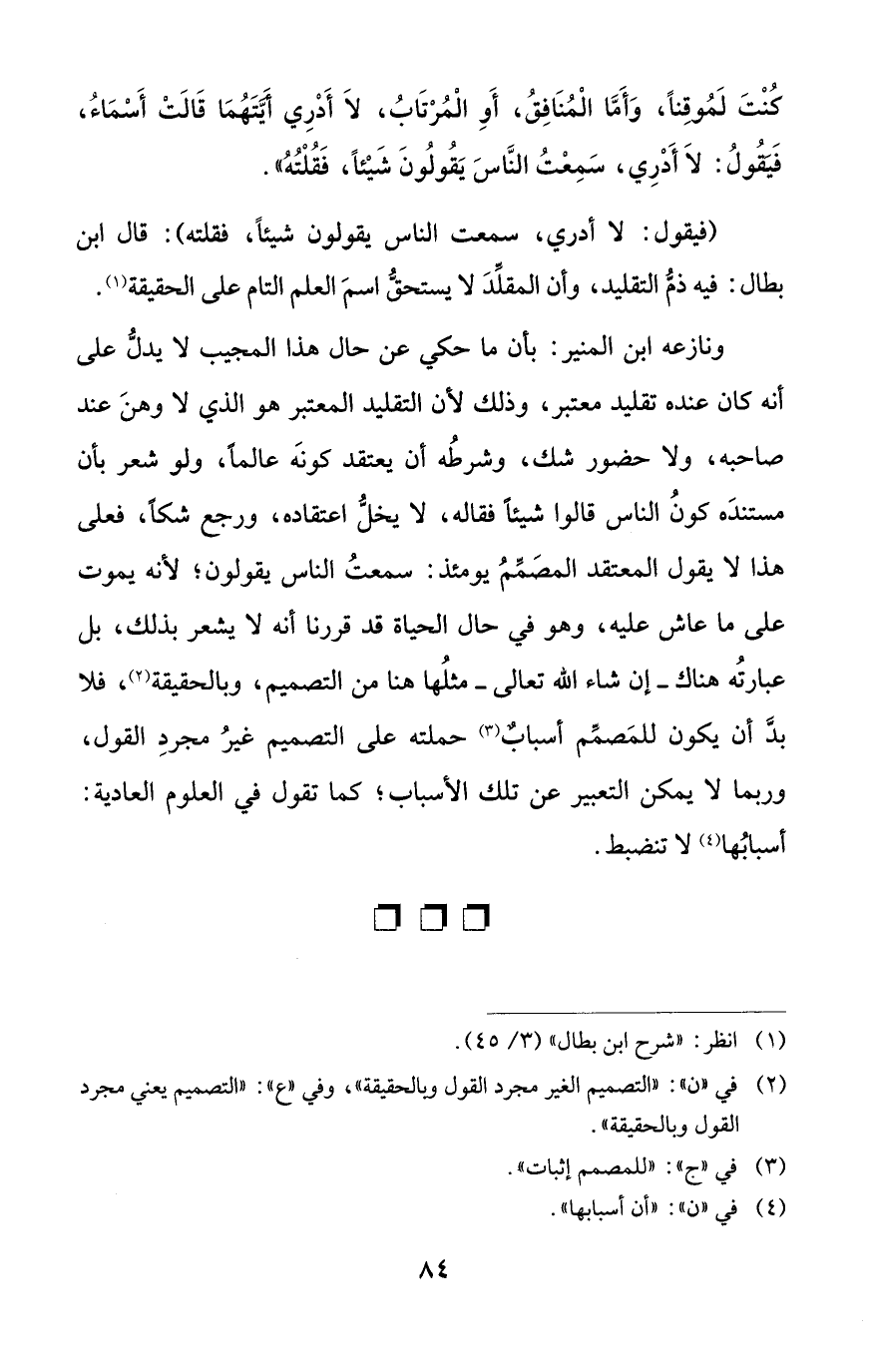 ونازعه ابن المنير: بأن ما حكي عن حال هذا المجيب لا يدلُّ على أنَّه كان عنده تقليد معتبر، وذلك لأنَّ التقليد المعتبر هو الذي لا وهنَ عند صاحبه، ولا حضور شك، وشرطُه أن يعتقد كونَه عالمًا، ولو شعر بأن مستندَه كونُ الناس قالوا شيئًا فقاله، لا يخلُّ اعتقاده، ورجع شكًا، فعلى هذا لا يقول المعتقد المصَمِّمُ يومئذ: سمعتُ الناس يقولون؛ لأنه يموت على ما عاش عليه، وهو في حال الحياة قد قررنا أنَّه لا يشعر بذلك، بل عبارتُه هناك -إن شاء الله تعالى- مثلُها هنا من التصميم، وبالحقيقة (¬2)، فلا بدَّ أن يكون للمَصمَّم أسبابٌ (¬3) حملته على التصميم غيرُ مجردِ القول، وربما لا يمكن التعبير عن تلك الأسباب؛ كما تقول في العلوم العادية: أسبابُها (¬4) لا تنضبط.
