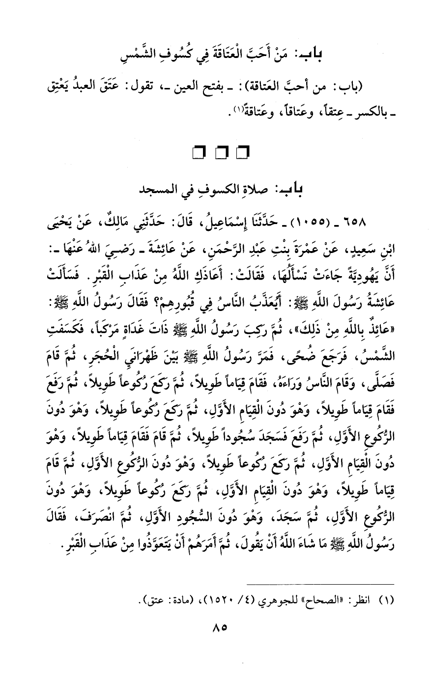 658 - (1055) - حَدَّثَنا إِسْماعِيلُ، قَالَ: حَدَّثَنِي مالِك، عَنْ يَحيىَ ابْنِ سَعِيدٍ، عَنْ عَمْرَةَ بِنْتِ عَبْدِ الرَّحمَنِ، عَنْ عائِشَةَ -رَضِيَ اللهُ عَنْها-: أَنَّ يَهُودِيَّةً جاءَتْ تَسْألها، فَقالَتْ: أَعاذَكِ الله مِنْ عَذابِ الْقَبْرِ. فَسَأَلَتْ عائِشَةُ رَسُولَ اللهِ - صلى الله عليه وسلم -: أيعَذَّبُ النّاسُ في قُبُورِهِمْ؟ فَقالَ رَسُولُ اللهِ - صلى الله عليه وسلم -: "عائِذٌ بِاللهِ مِنْ ذَلِكَ"، ثُمَّ ركبَ رَسُولُ اللهِ - صلى الله عليه وسلم - ذاتَ غَداةٍ مَركبًا، فَكَسَفَتِ الشَّمْسُ، فَرَجَعَ ضُحًى، فَمَرَّ رَسُولُ اللهِ - صلى الله عليه وسلم - بَيْنَ ظَهْرانيِ الْحُجَرِ، ثُمَّ قامَ فَصَلَّى، وَقامَ النّاسُ وَراءَهُ، فَقامَ قِيامًا طَوِيلًا، ثُمَّ ركعَ رُكوعًا طَوِيلًا، ثُمَّ رَفَعَ فَقامَ قِيامًا طَوِيلًا، وَهْوَ دُونَ الْقِيامِ الأَوَّلِ، ثُمَّ ركعَ رُكوعًا طَوِيلًا، وَهْوَ دُونَ الرُّكوعِ الأَوَّلِ، ثُمَّ رَفَعَ فَسَجَدَ سُجُودًا طَوِيلًا، ثُمَّ قامَ فَقامَ قِيامًا طَوِيلًا، وَهْوَ دُونَ الْقِيامِ الأَوَّلِ، ثُمَّ ركعَ رُكوعًا طَوِيلًا، وَهْوَ دُونَ الرُّكوعِ الأَوَّلِ، ثُمَّ قامَ قِيامًا طَوِيلًا، وَهْوَ دُونَ الْقِيامِ الأَوَّلِ، ثُمَّ ركَعَ رُكوعًا طَوِيلًا، وَهْوَ دُونَ الرُّكُوعِ الأَوَّلِ، ثُمَّ سَجَدَ، وَهْوَ دُونَ السُّجُودِ الأَوَّلِ، ثُمَّ انْصَرَفَ، فَقالَ رَسُولُ اللهِ - صلى الله عليه وسلم - ما شاءَ الله أَنْ يَقُولَ، ثُمَّ أَمَرَهُمْ أَنْ يتَعَوَّذُوا مِنْ عَذابِ الْقَبْرِ.