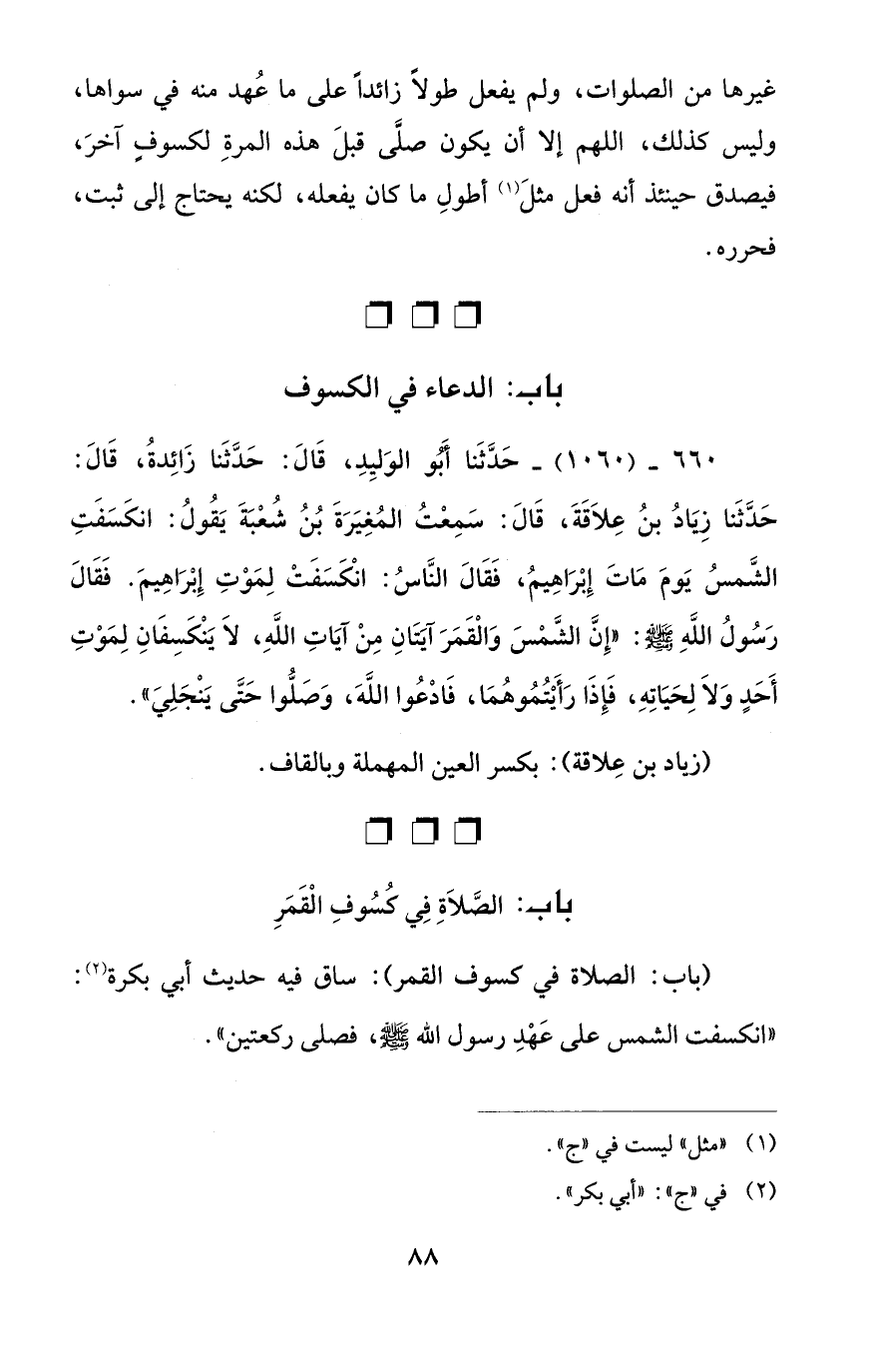 660 - (1060) - حَدَّثَنا أبَو الوَليِدِ، قَالَ: حَدَّثَنا زائِدةُ، قَالَ: حَدَّثَنا زِيادُ بنُ عِلاَقَةَ، قَالَ: سَمِعْتُ المُغِيَرَةَ بُنُ شُعْبَةَ يَقُولُ: انكَسَفَتِ الشَّمسُ يَومَ ماتَ إِبْراهِيمُ، فَقالَ النّاسُ: انْكَسَفَتْ لِمَوْتِ إِبْراهِيمَ. فَقالَ رَسُولُ اللهِ - صلى الله عليه وسلم -: "إِنَّ الشَّمْسَ والْقَمَرَ آيَتانِ مِنْ آياتِ اللهِ، لا يَنْكَسِفانِ لِمَوْتِ أَحَدٍ وَلا لِحَياتِهِ، فَإِذا رَأَيْتُمُوهُما، فادعُوا اللهَ، وَصَلُّوا حَتَّى يَنْجَلِيَ".