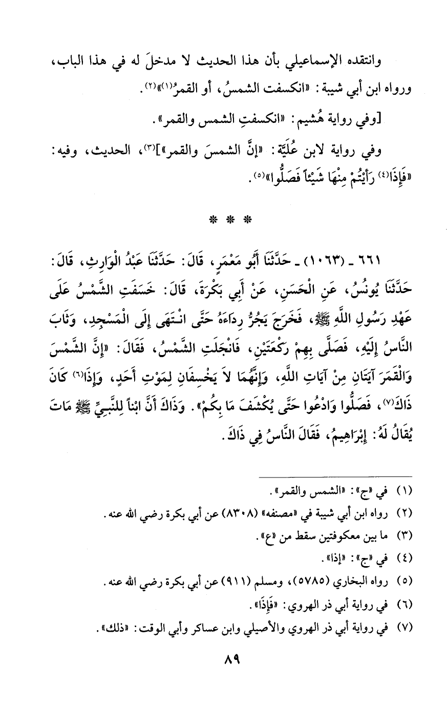 661 - (1063) - حَدَّثَنا أَبُو مَعْمَرٍ، قَالَ: حَدَّثَنا عَبْدُ الْوارِثِ، قَالَ: حَدَّثَنا يُونسٌ، عَنِ الْحَسَنِ، عَنْ أِبي بَكْرَةَ، قَالَ: خَسَفَتِ الشَّمْسُ عَلَى عَهْدِ رَسُولِ اللهِ - صلى الله عليه وسلم -، فَخَرَجَ يَجُرُّ رِداءَهُ حَتَّى انْتَهَى إِلَى الْمَسْجدِ، وَثابَ النّاسُ إِلَيْهِ، فَصَلَّى بِهِمْ ركعَتَيْنِ، فانْجَلَتِ الشَّمْسُ، فَقالَ: "إِنَّ الشَّمْسَ والْقَمَرَ آيَتانِ مِنْ آياتِ اللهِ، وَإِنَّهُما لا يَخْسِفانِ لِمَوْتِ أَحَدٍ، وَإذا (¬6) كانَ ذاكَ (¬7)، فَصَلُّوا وادعُوا حَتَّى يُكْشَفَ ما بِكُمْ". وَذاكَ أَنَّ ابْنًا لِلنَّبِيِّ - صلى الله عليه وسلم - ماتَ يُقالُ لَهُ: إِبْراهِيمُ، فَقالَ النّاسُ في ذاكَ.