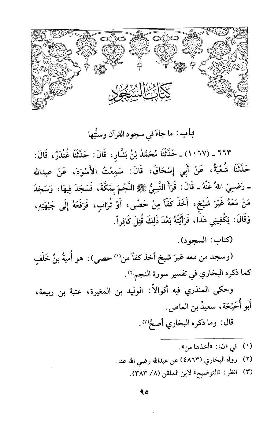 663 - (1067) - حَدَثَنا مُحَمَدُ بْنُ بَشارٍ، قَالَ: حَدَثَنا غُنْدَرٌ، قَالَ: حَدَّثَنا شُعبةُ، عَنْ أَبي إِسْحاقَ، قَالَ: سمِعتُ الأَسْوَدَ، عَنْ عبد الله -رَضِيَ اللهٌ عَنْهُ- قَالَ: قَرَأَ النَّبِيُّ -صلى الله عليه وسلم- النَّجْمَ بِمَكَةَ، فَسَجَدَ فِيها، وَسَجَدَ مَنْ مَعَهُ غَيْرَ شَيْخٍ، أَخَذَ كَفًّا مِن حَصى، أَوْ تُرابٍ، فَرَفَعَهُ إِلَى جَبْهَتِهِ، وَقالَ: يَكْفِيني هَذا، فَرَأَيْتُهُ بعْدَ ذَلِكَ قُتِلَ كافِرًا.