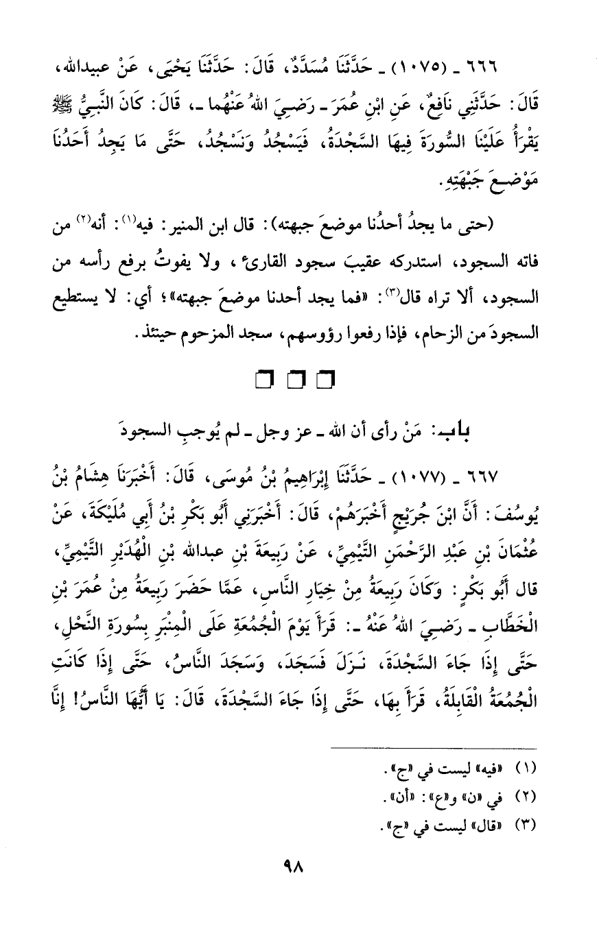 666 - (1075) - حَدَّثَنا مُسَدَّد، قَالَ: حَدَّثَنا يَحيىَ، عنْ عبيد الله، قَالَ: حَدَّثَنِي نَافِع، عَن ابْنِ عُمَرَ -رَضِيَ اللهُ عَنْهُما-، قَالَ: كان النَّبِيُّ -صلى الله عليه وسلم- يَقْرَأُ عَلَيْنا السُّورَةَ فِيها السَّجْدَةُ، فَيَسْجُدُ وَنسجُدُ، حَتَّى ما يَجِدُ أَحَدُنَا مَوْضعَ جَبْهَتِهِ.