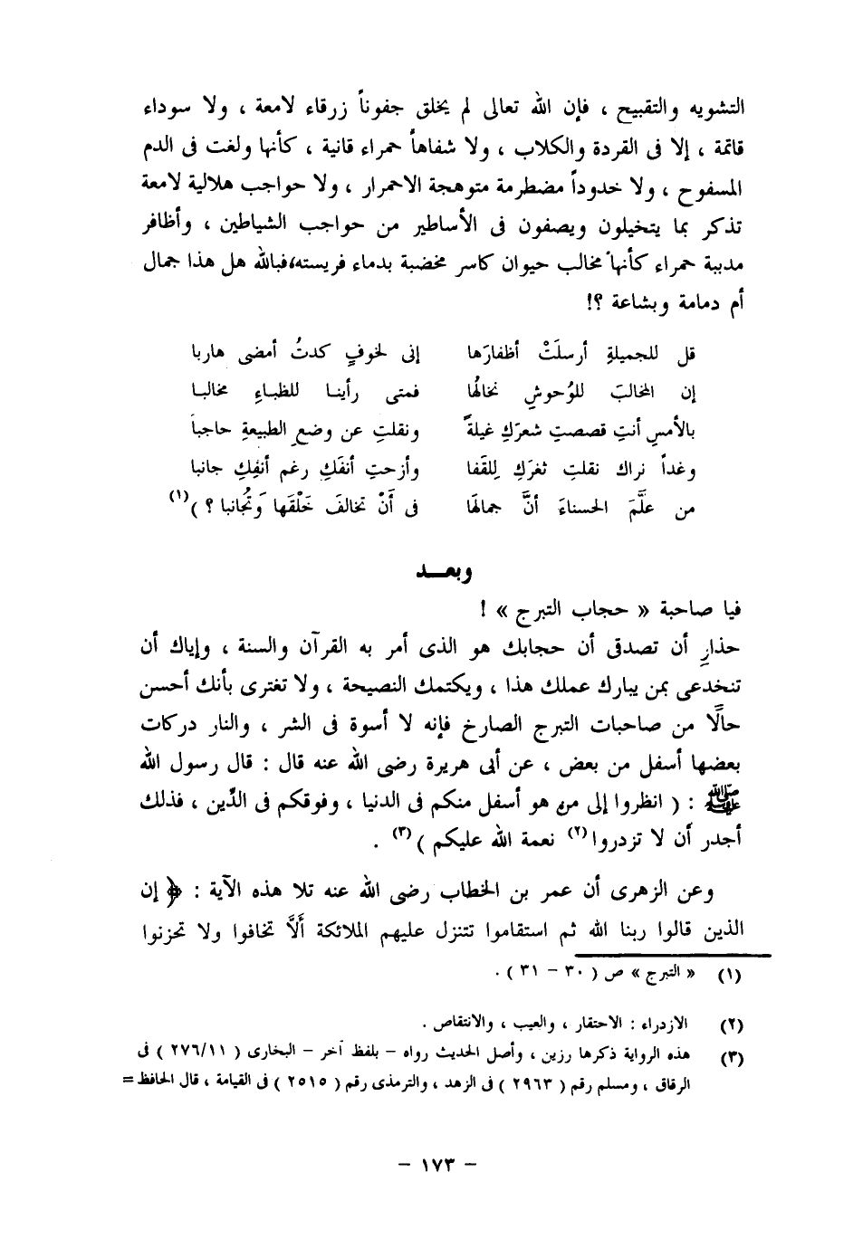 (1) بل من الواجب أيضًا دعوة المتبرجات إلى اتباع سبيل المؤمنات، وتغيير هذا العرف الفاسد حتى يعود موافقَا للشرع المطهر.