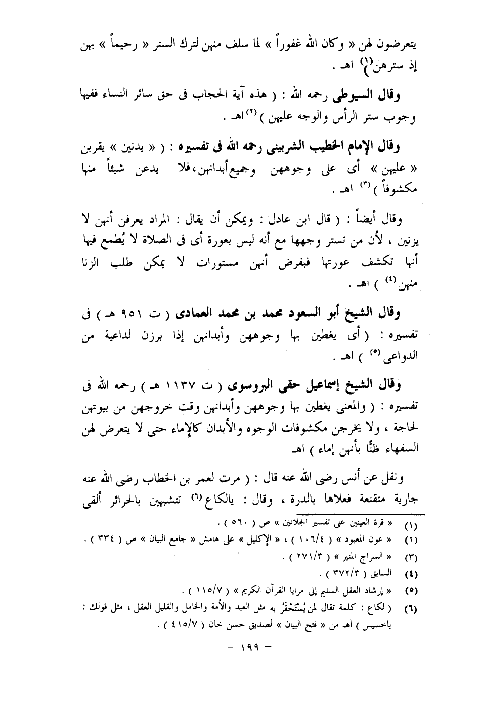 وقال أيضا: قوله تعالى: (مِنْ جَلَابِيبِهِنَّ) الجلابيب: جمع جلباب، وهو ثوب أكبر من الخمار، وروي عن ابن عباس وابن مسعود أنه الرداء؟ وقد قيل: إنه القناع، والصحيح أنه الثوب الذي يستر جميع البدن، وفي صحيح مسلم عن أم عطية قالت: قلت: يا رسول الله! إحدانا لا يكون لها جلباب؟، قال: "لتلبسها أختها من جلبابها" اهـ.