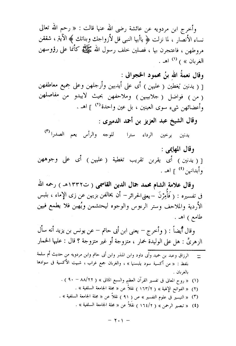 والجلباب إزار واسع يُلْتَحَفُ به، فما قيل: إن النظم (عَلَيْهِنَّ) دون "على وجوههن"، وقد فسره بستر وجوههن وأبدانهن به، فكيف يصح الحمل على التبعيض حينئذ، إذ لا يصح لفظ "البعض" في موضع "مِنْ" إلا أن يبقى بعض من الجلباب غير مستعمل في الوجه والبدن، ليس بشيء، لأن قوله: (عَلَيْهِنَّ) إما على تقدير مضاف أي على رؤوسهن، أو وجوههن، أو على أنه مفهوم منه - وإن لم يقّدَّر-، وأما قوله: "وأبدانهن" فبيان للواقع؛ لأنها إذا أرخت على الوجه بعضَه بقي باقيه على البدن، لكن المأمور به ضم بعض منه لأن به الصيانة، قوله: "عن الإماء والقينات " إما من عطف أحد المترادفين أو المراد بالقينات البغايا، وأما إرادة المغنية فلا وجه له، وقوله: "يميزن" فالمراد بالمعرفة التمييز مجازا لأنه المقصود، ولو
