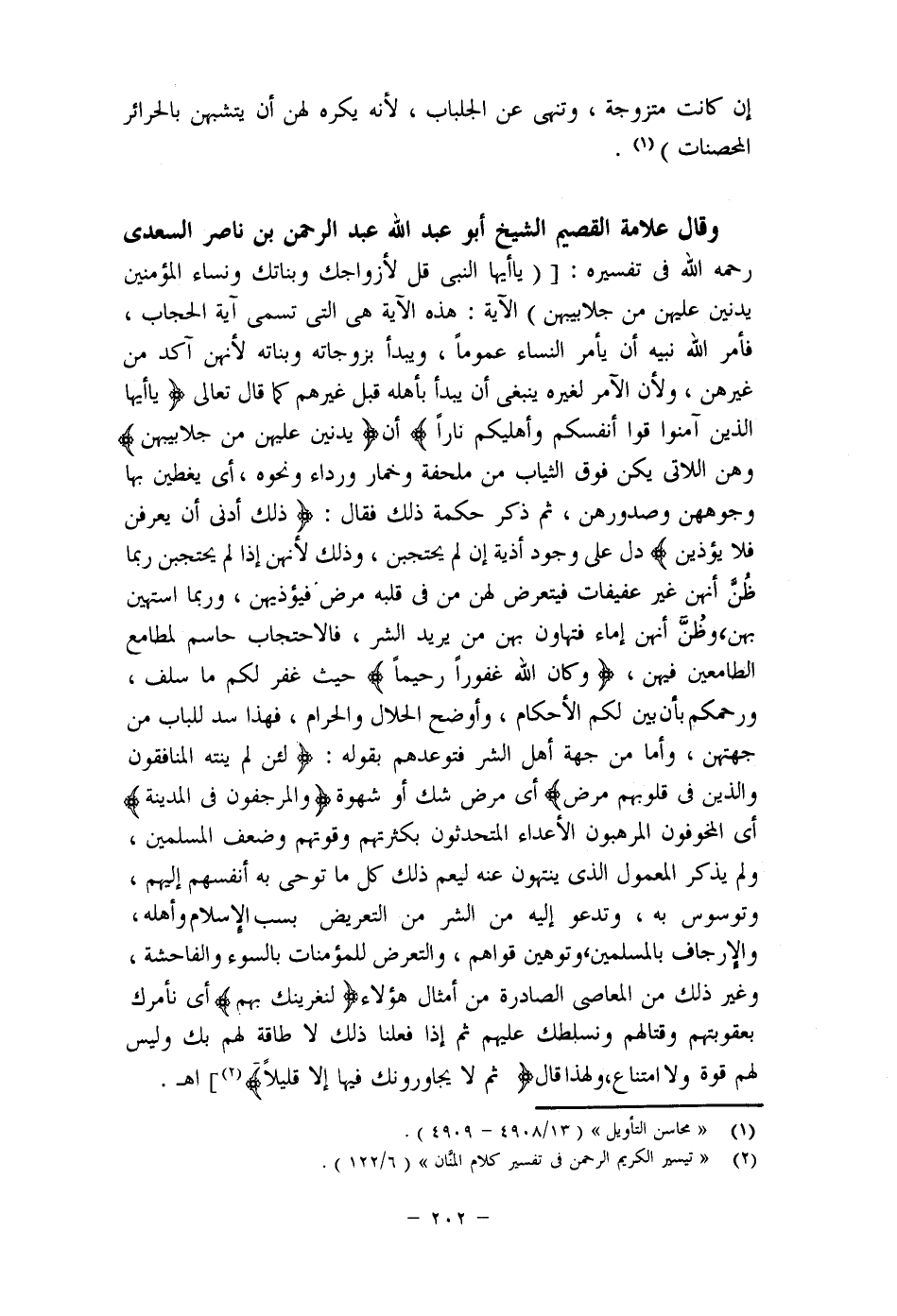 (3) (وهذا الذي نقله النسفي في تفسيره يدل دلالة ظاهرة على أن المرأة المسلمة في المجتمعات الإسلامية تستر وجهها، وكان الإدناء للثوب عندما ينقشع عن وجه المرأة متعارفًا عليه بين المسلمين حتى مضت هذه الصورة مثالَا يحتذى) اهـ من تعليق الشيخ عبد العزيز بن خلف "نظرات في كتاب حجاب المرأة المسلمة للألباني" هامش ص (51) .