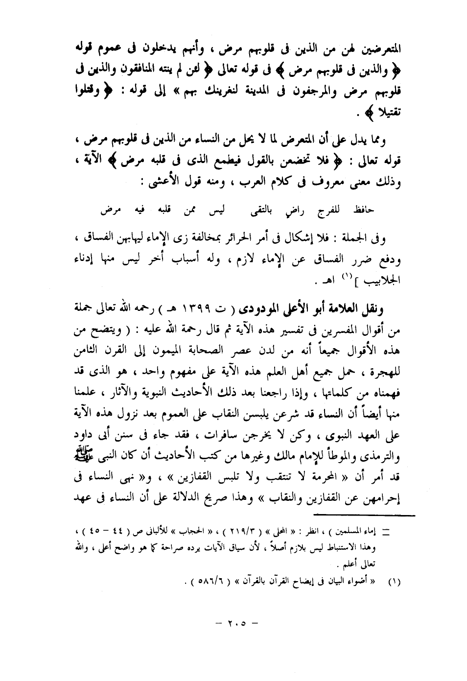 ... وقال السدي: (تغطي إحدى عينيها وجبهتها والشق الآخر إلا العين "، وكذا عادة بلاد الأندلس لا يظهر من المرأة إلا عينها الواحدة) (4) . وقال أيضا رحمه الله: والظاهر أن قوله: (وَنِسَاءِ الْمُؤْمِنِينَ) يشمل