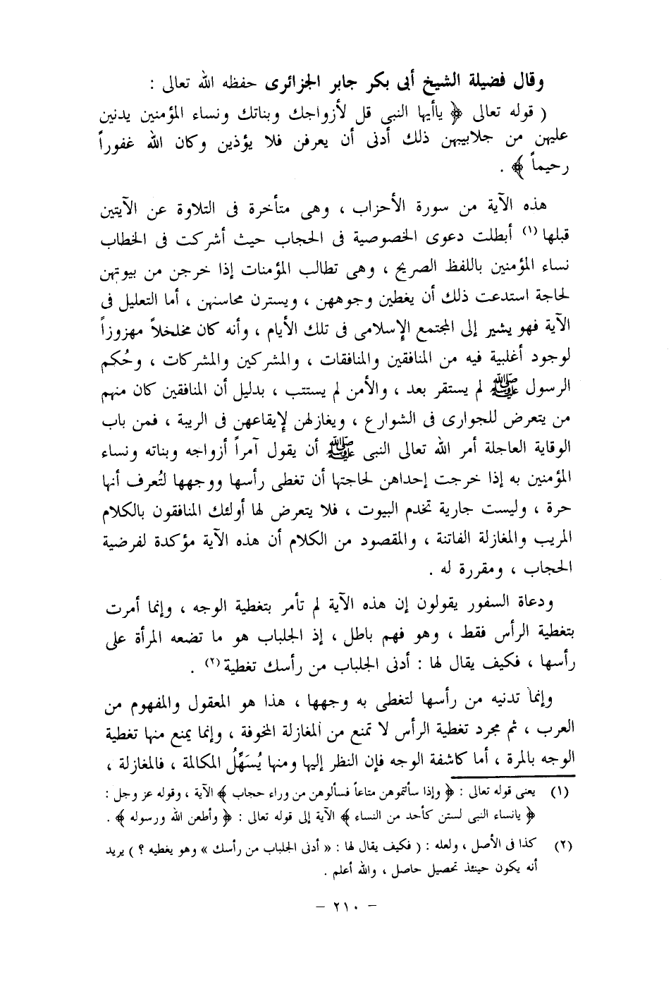 وقال محمد بن سيرين: "سألت عبيدة السلماني عن قول الله تعالى: (يُدْنِينَ عَلَيْهِنَّ مِنْ جَلَابِيبِهِنَّ) فغطى وجهه ورأسه، وأبرز عينه اليسرى (1) . اهـ (2) .