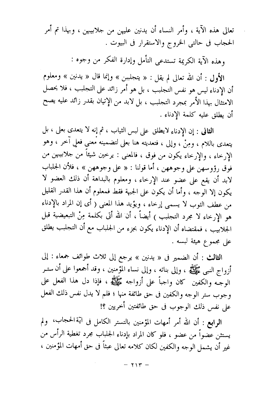 وأخرج ابن مردويه عن عائشة رضي الله عنها قالت: "رحم الله تعالى نساء الأنصار، لما نزلت (يَا أَيُّهَا النَّبِيُّ قُلْ لِأَزْوَاجِكَ وَبَنَاتِكَ) الآية، شققن مروطهن، فاعتجرن بها، فصلين خلف رسول الله صلى الله عليه وسلم كأنما على رؤوسهن الغربان (2) . اهـ.