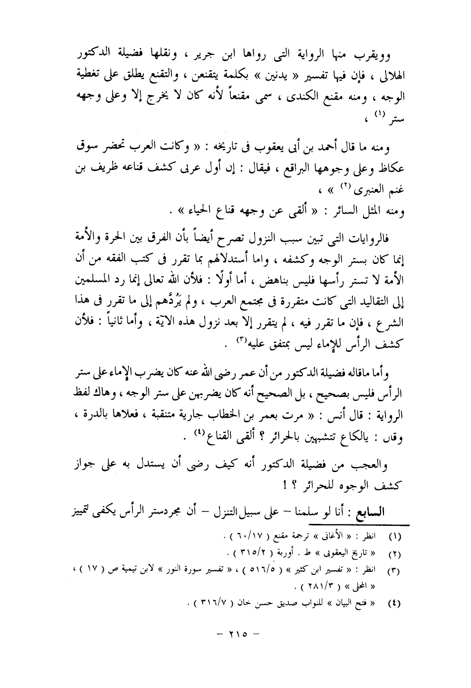 ومن الأدلة القرآنية على احتجاب المرأة وسترها جميع بدنها حتى وجهها قوله تعالى: (يَا أَيُّهَا النَّبِيُّ قُلْ لِأَزْوَاجِكَ وَبَنَاتِكَ وَنِسَاءِ الْمُؤْمِنِينَ يُدْنِينَ عَلَيْهِنَّ مِنْ جَلَابِيبِهِنَّ) فقد قال غير واحد من أهل العلم: إن معنى (يُدْنِينَ عَلَيْهِنَّ مِنْ
