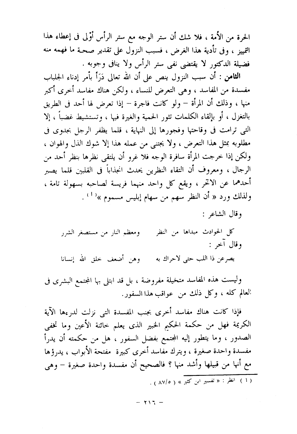 ومن الأدلة على ذلك أيضَا هو ما قدمنا في سورة النور (1) في الكلام على قوله تعالى: (وَلَا يُبْدِينَ زِينَتَهُنَّ إِلَّا مَا ظَهَرَ مِنْهَا) من أن استقراء القرآن يدل على أن معنى: (إِلَّا مَا ظَهَرَ مِنْهَا) الملاءة فوق الثياب، وأنه لا يصح تفسير (إِلَّا مَا ظَهَرَ مِنْهَا) بالوجه والكفين كما تقدم إيضاحه، وأعلم أن قول من قال: "إنه قد قامت قرينة قرآنية على أن قوله تعالى: (يُدْنِينَ عَلَيْهِنَّ مِنْ جَلَابِيبِهِنَّ) لا يدخل فيه ستر الوجه، وأن القرينة المذكورة هي قوله تعالى: (ذَلِكَ أَدْنَى أَنْ يُعْرَفْنَ) قال: وقد دل قوله: (أَنْ يُعْرَفْنَ) على أنهن سافرات كاشفات عن وجوههن لأن التي تستر وجهها لا تعرف " باطل، وبطلانه واضح، وسياق الآية يمنعه منْعًا باتا لأن قوله: