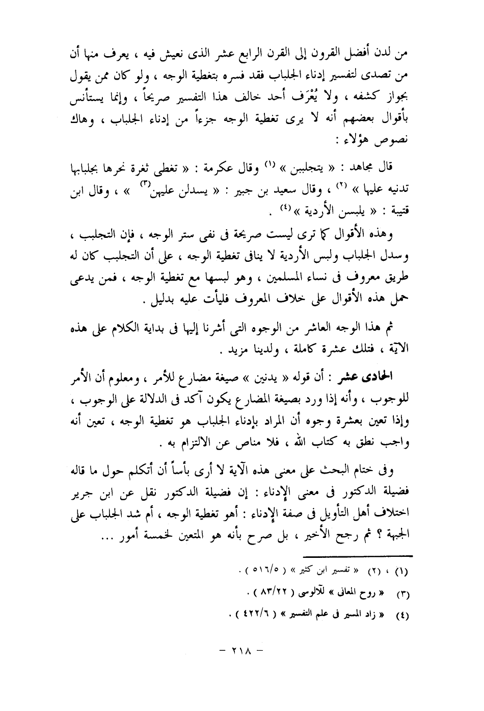 "ويتضح من هذه الأقوال جميعا أنه من لدن عصر الصحابة الميمون إلى القرن الثامن للهجرة، حمل جميع أهل العلم هذه الآية على مفهوم واحد، هو الذي قد فهمناه من كلماتها، وإذا راجعنا بعد ذلك الأحاديث النبوية والآثار، علمنا منها أيضا أن النساء قد شرعن يلبسن النقاب على العموم
