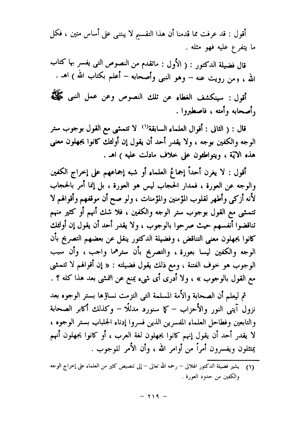 بعد نزول هذه الآية على العهد النبوي، وكن لا يخرجن سافرات، فقد جاء في سنن أبي داود والترمذي والموطأ للإمام مالك وغيرها من كتب الأحاديث أن كان النبي صلى الله عليه وسلم قد أمر أن "المحرمة لا تنتقب ولا تلبس القفازين"، و"نهى النساء في إحرامهن عن القفازين والنقاب" وهذا صريح الدلالة على أن النساء في عهد النبوة قد تعودن الانتقاب ولبس القفازين عامة، فنهين عنه في الإحرام، ولم يكن المقصود بهذا الحكم أن تُعْرَضَ الوجوه في موسم الحج عرضا، بل كان المقصود في الحقيقة أن لا يكون القناع جزءا من هيئة الإحرام المتواضعة، كما يكون جزءًا من لباسهن عادة، فقد ورد في الأحاديث الأخرى تصريح بأن أزواج النبي صلى الله عليه وسلم وعامة المسلمات كنَّ يخفين وجوههن عن الأجانب في حالة إحرامهن أيضا، ففي سنن أبي داود عن عائشة رضي الله عنها قالت: "كان الركبان يمرون بنا ونحن مع رسول الله صلى الله عليه وسلم محرمات، فإذا حاذَوْا بنا سدلت إحدانا جلبابها من رأسها على وجهها، فإذا جاوزونا كشفناه" (1) ، وفي الموطأ للإمام مالك عن فاطمة بنت المنذر قالت: "كنا نخمر وجوهنا ونحن محرمات، ونحن مع أسماء بنت أبي بكر الصديق رضي الله عنهما، فلا تنكره علينا" (2) .